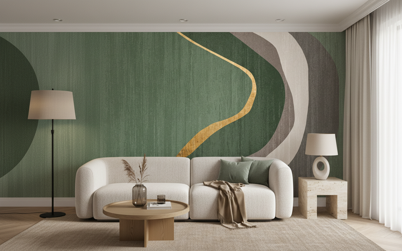 Ce papier peint contemporain dévoile une composition graphique d’une élégance rare, où des formes géométriques courbes s’entrelacent dans une danse harmonieuse. Un ruban doré métallisé traverse délicatement l’ensemble, créant un contraste saisissant avec les tons verts olive et les nuances poudrées de beige et de taupe. La texture brossée qui caractérise ce design évoque subtilement l’art de l’aquarelle moderne, tandis que les lignes fluides rappellent les méandres d’une rivière vue du ciel ou les courbes naturelles d’un paysage vallonné.