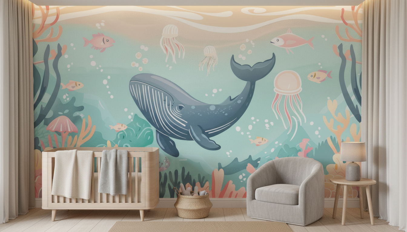 Ce papier peint océanique dévoile un univers sous-marin d’une tendresse infinie, orchestré dans une palette de couleurs douces mêlant vert d’eau, rose poudré et beige nacré. Au cœur de cette composition artistique trône une majestueuse baleine bleue aux reflets nacrés, dont les rayures blanches évoquent la grâce naturelle des géants des mers. Son style graphique délicat, entre illustration moderne et aquarelle stylisée, confère à l’ensemble une sophistication contemporaine teintée de douceur enfantine.