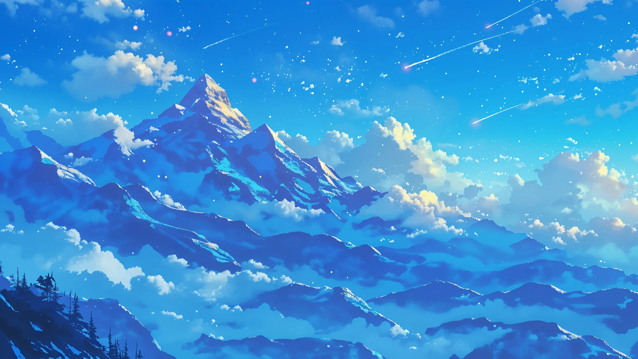 L’artiste a privilégié un style digital painting d’inspiration anime, mêlant réalisme et onirisme avec une maîtrise remarquable des jeux de lumière. La palette chromatique se décline dans des tons azur, cyan et blanc immaculé, ponctuée de touches dorées et rosées qui réchauffent l’ensemble. Les météores étincelants qui zèbrent le firmament apportent une dimension cosmique et poétique à cette vision épique de la haute montagne.