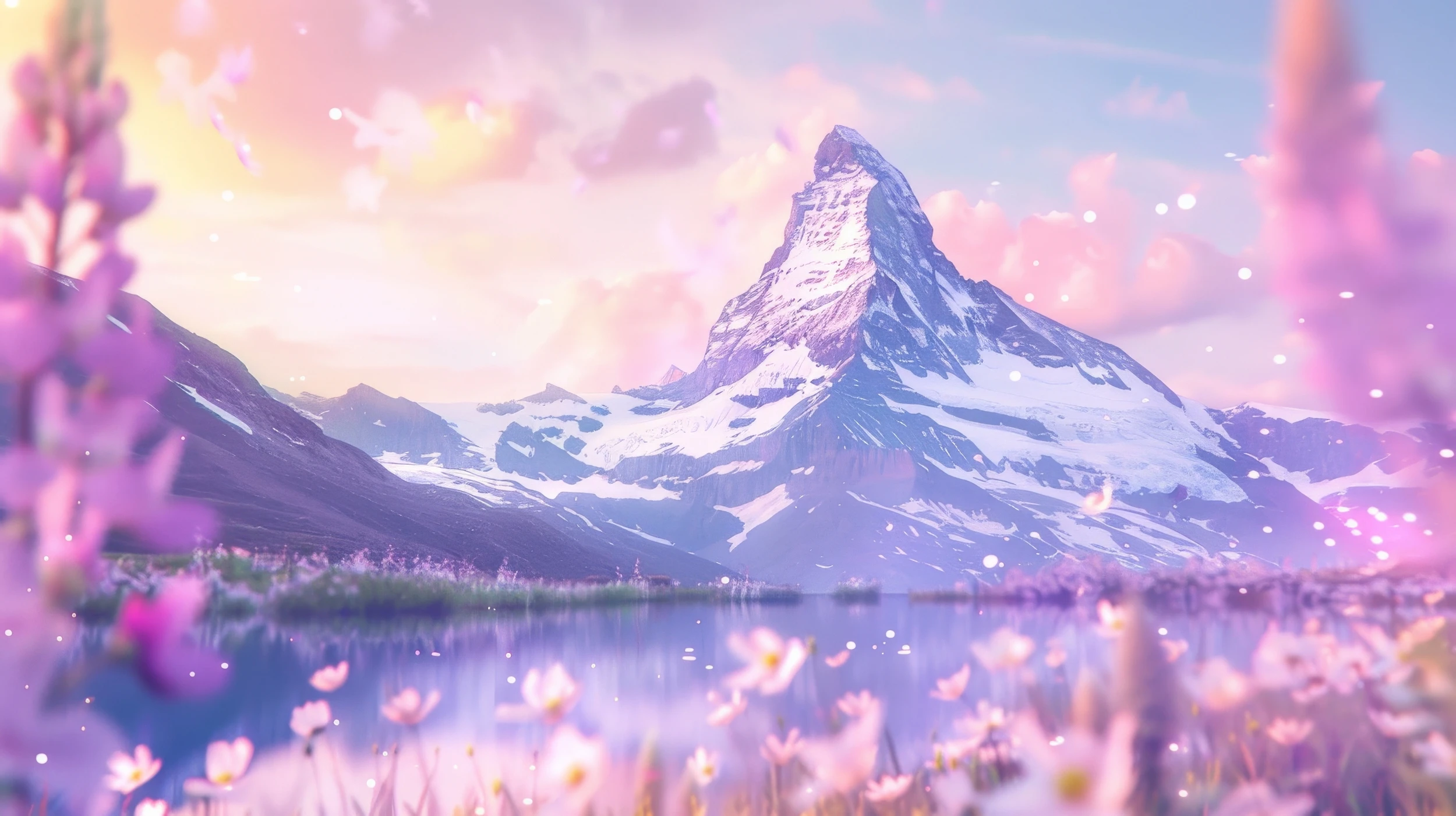 Laissez-vous porter par cette symphonie de couleurs où les tons rosés et violets dansent avec la majesté alpine dans un ballet féérique et enchanteur.