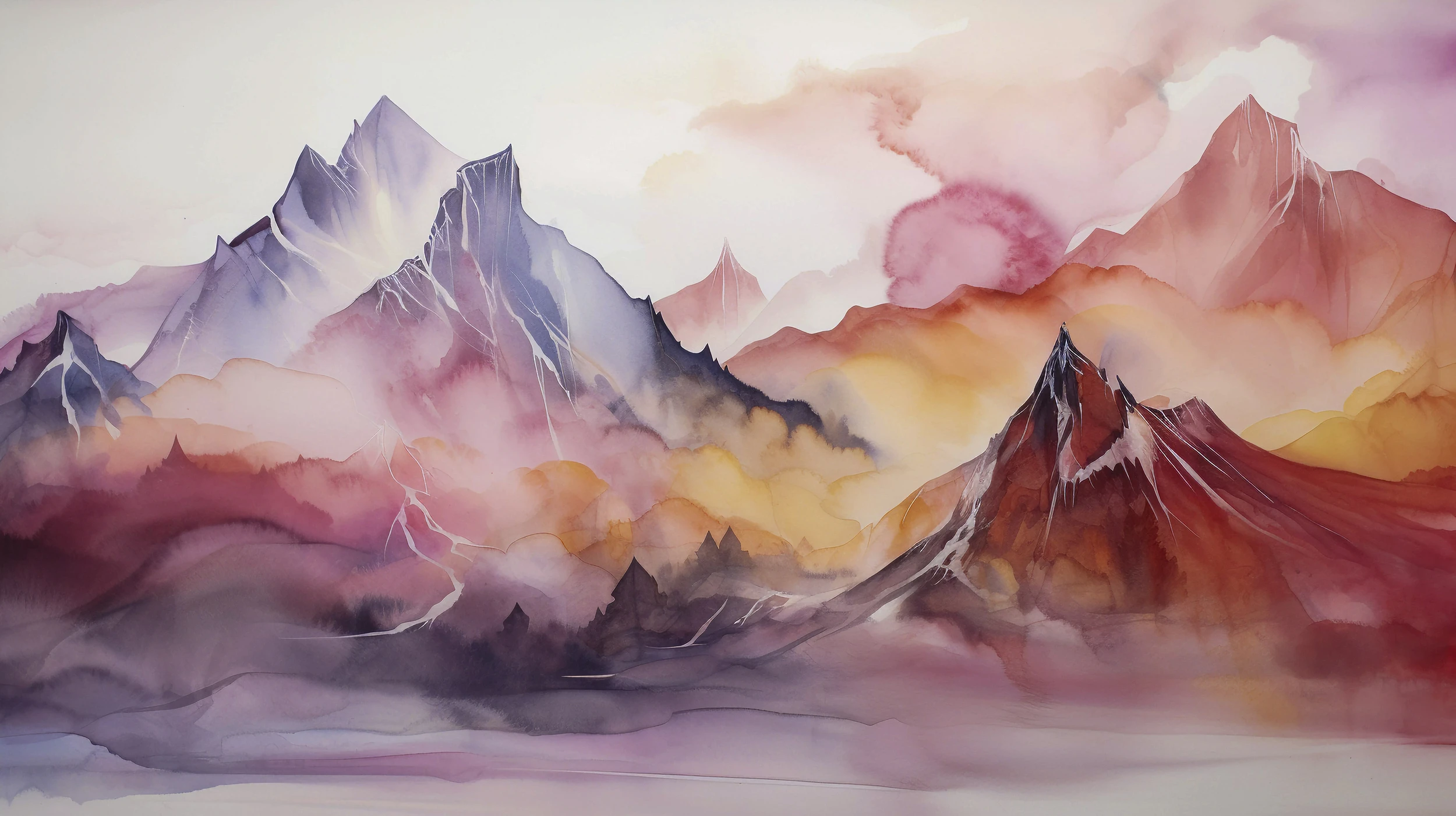 Les nuages volumineux flottent avec grâce entre les pics rocheux, apportant une dimension onirique à cette composition paysagère. Chaque montagne aquarellée présente des détails géologiques suggérés avec finesse : arêtes rocheuses, faces abruptes et pentes douces se dessinent dans un jeu d’ombres et de lumières particulièrement réussi. L’ensemble crée un effet de profondeur saisissant, comme une fenêtre ouverte sur un horizon infini.