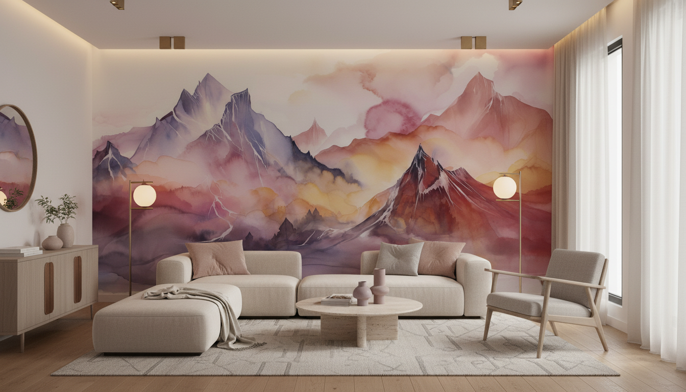 Ce papier peint panoramique dévoile un paysage montagneux d’une délicatesse remarquable, traité dans un style aquarelle moderne aux transparences subtiles. Les montagnes stylisées s’étagent harmonieusement, créant une perspective profonde qui agrandit instantanément l’espace. La technique picturale révèle des dégradés vaporeux où se mêlent avec raffinement les tons roses poudrés, les violets lavande, les ocres dorés et les bleus ardoise. Cette palette chromatique sophistiquée évoque les heures magiques du crépuscule alpin, quand la lumière caresse tendrement les sommets enneigés.
