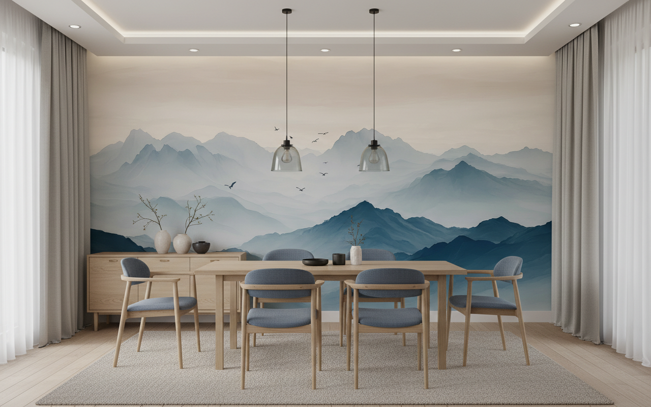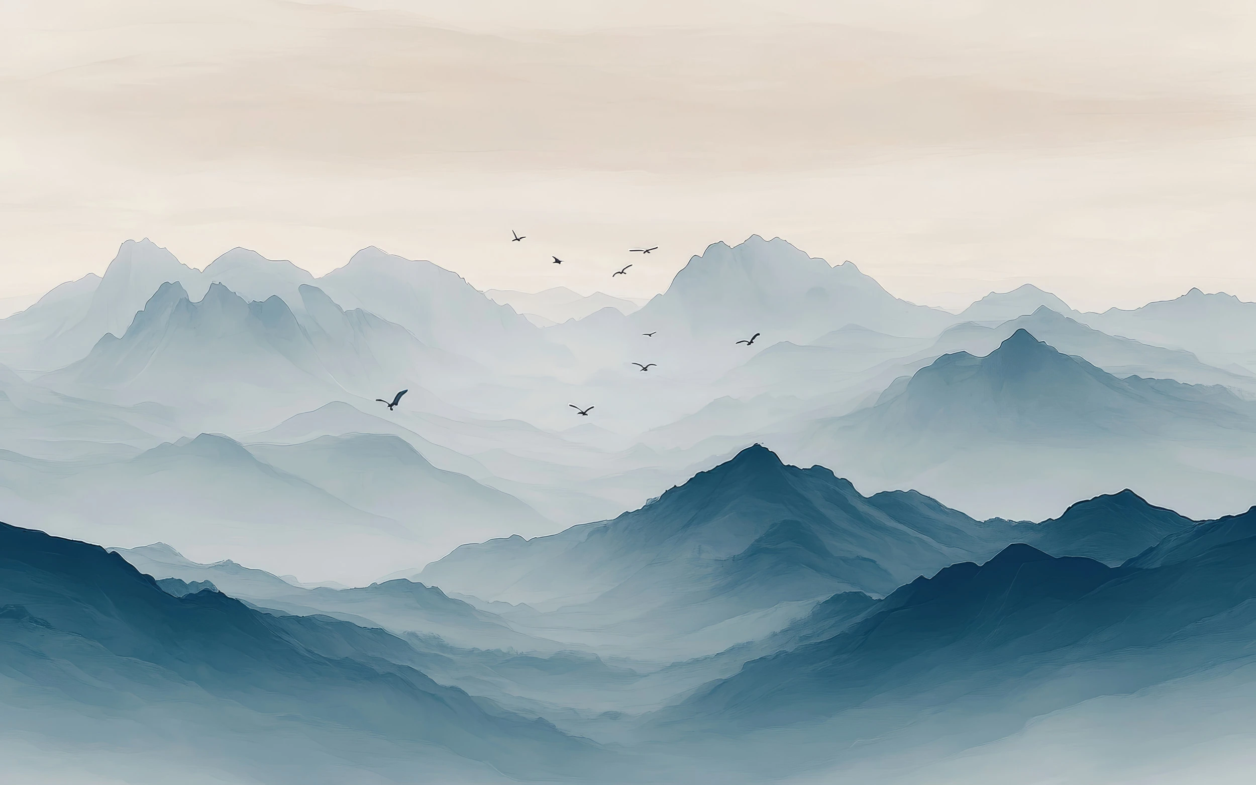 Ce papier peint paysage montagnard révèle une composition d’une élégance saisissante, orchestrée dans une palette de bleus dégradés allant du bleu marine profond au bleu gris nacré. Les chaînes de montagnes se superposent en plans successifs, créant un effet de profondeur hypnotisant grâce à la technique de l’aquarelle moderne. Quelques oiseaux en vol ponctuent délicatement cette symphonie visuelle, leurs silhouettes noires contrastant subtilement avec la douceur des tons poudrés. L’ensemble évoque un style minimaliste contemporain teinté d’influences asiatiques, où chaque nuance de bleu pastel raconte une histoire de quiétude.