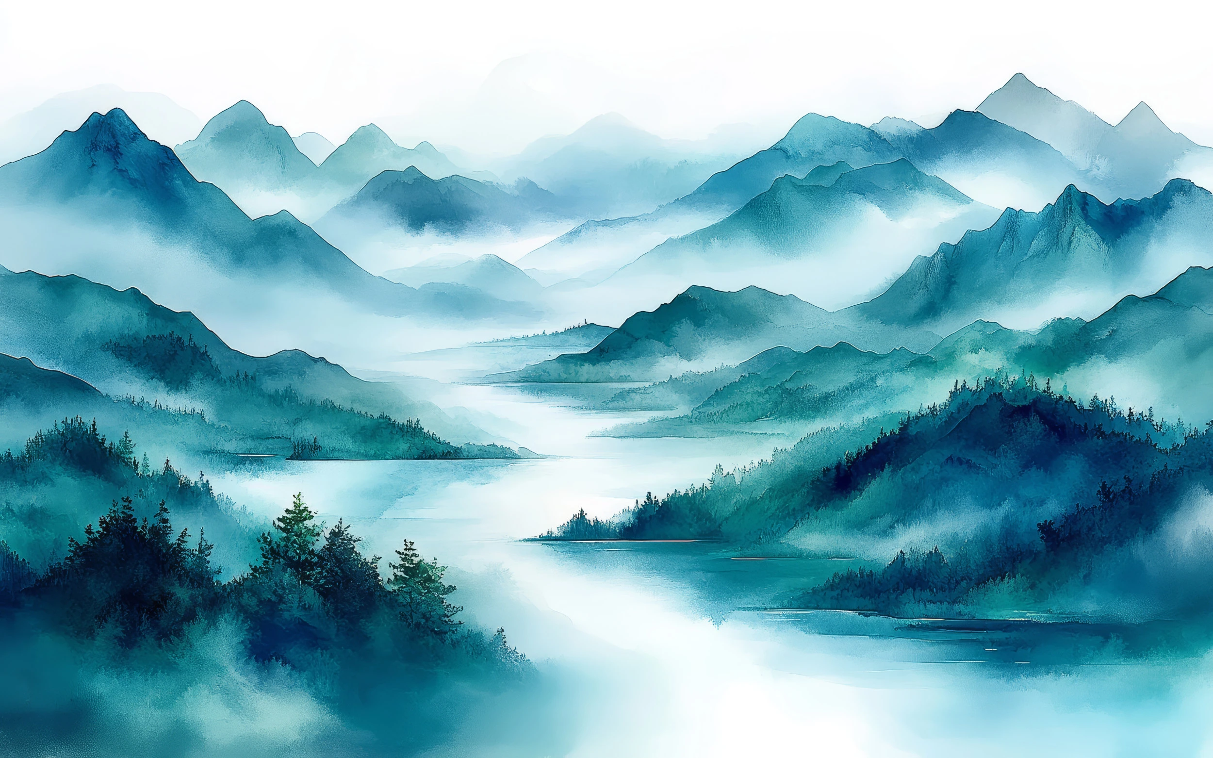 Ce papier peint panoramique dévoile un paysage montagneux d’une beauté saisissante, orchestré dans une symphonie de tons bleus et turquoise. Les reliefs s’étagent harmonieusement, créant une perspective infinie où chaque sommet enneigé se fond délicatement dans la brume matinale. Au cœur de cette composition aquarellée, un lac cristallin serpente gracieusement entre les vallées, reflétant la sérénité des cimes environnantes. La technique aquarelle confère à l’ensemble une douceur poétique, où les nuances dégradées évoquent la peinture traditionnelle chinoise. Les forêts de conifères ponctuent les pentes de touches plus sombres, apportant profondeur et mystère à cette fresque murale naturelle.