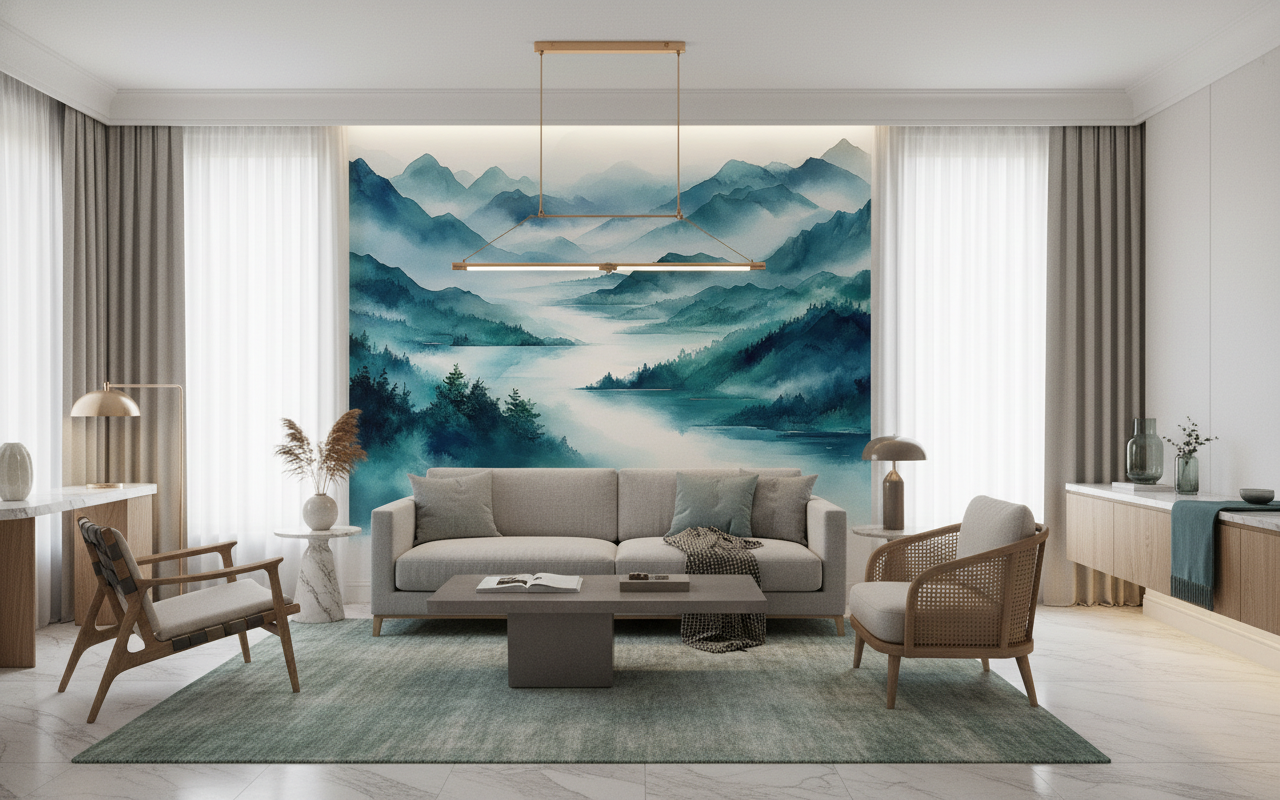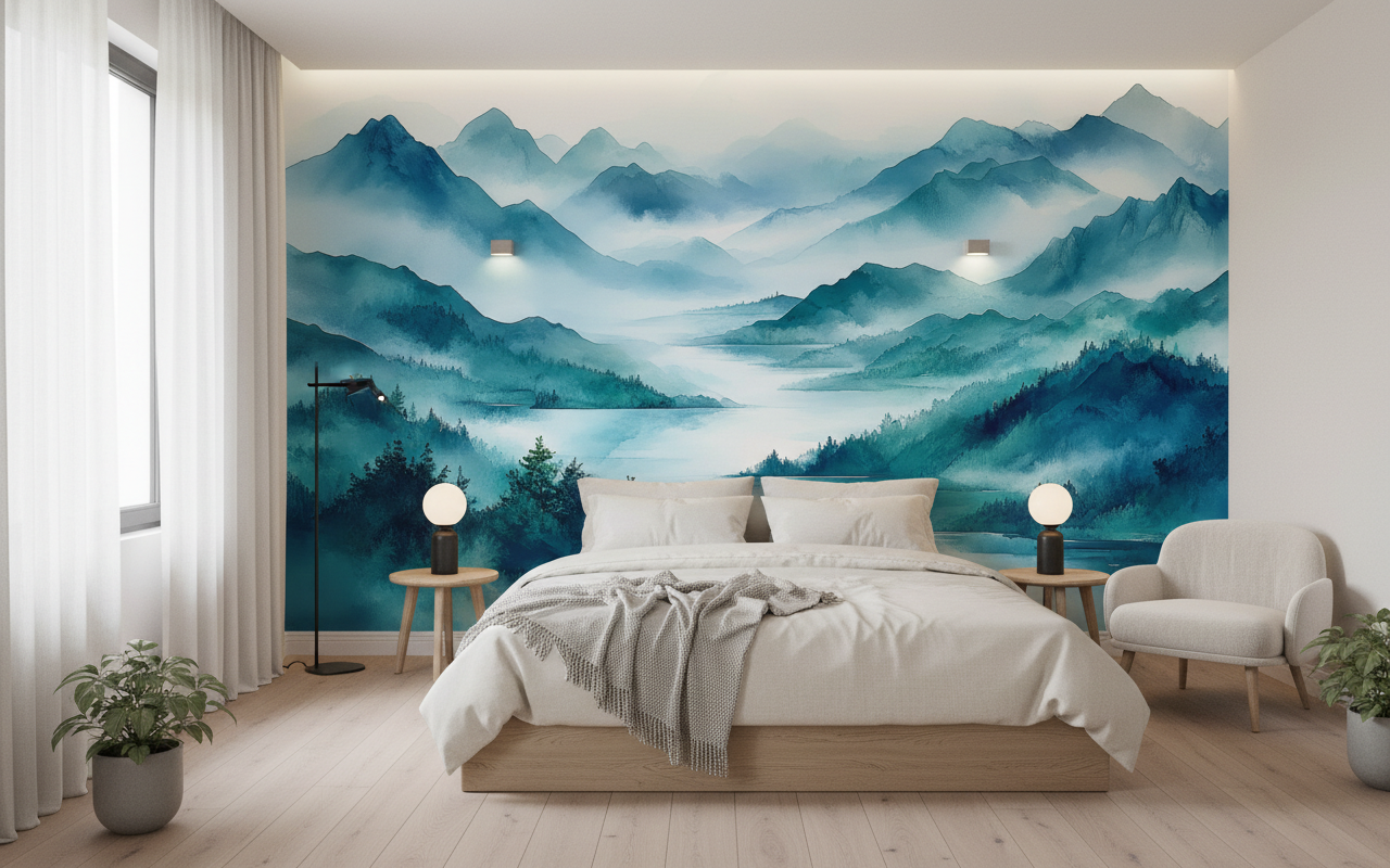 Ce papier peint paysage montagnard trouve sa place idéale dans un salon contemporain, où il créera un point focal saisissant derrière un canapé en lin naturel ou des fauteuils en bois clair. Dans une chambre parentale, il favorisera la détente et un sommeil réparateur grâce à ses tonalités apaisantes. Associez-le à des matières nobles comme le bambou, le rotin ou des textiles en coton bio pour créer une ambiance feng shui harmonieuse. Les accents dorés ou cuivrés viendront réchauffer délicatement cette palette froide, tandis que des plantes vertes comme les fougères ou les palmiers d’intérieur renforceront cette connexion avec la nature.