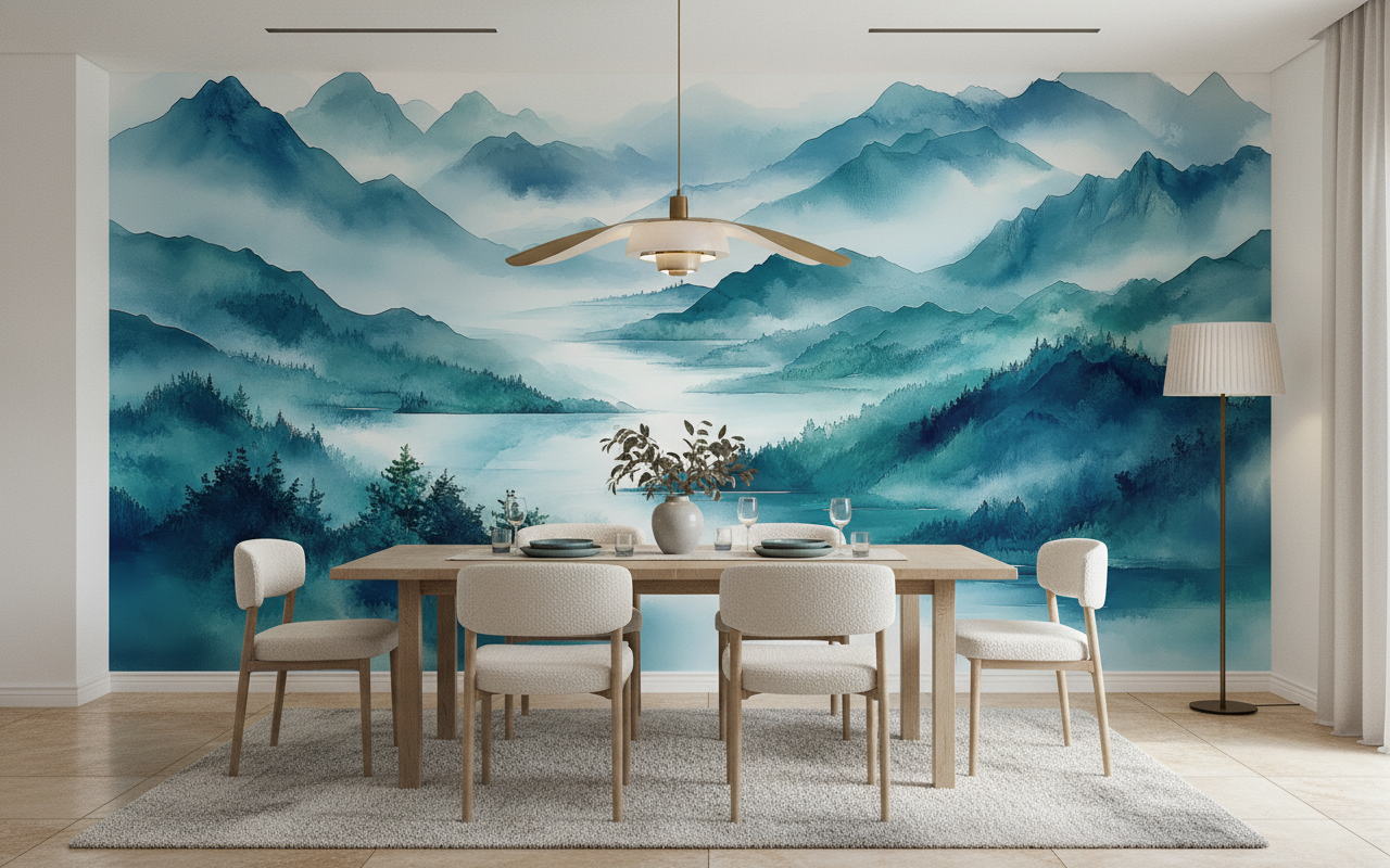 Évadez-vous avec ce papier peint panoramique « Montagnes Brumeuses » en aquarelle bleue. Transformez votre intérieur en un havre de paix et d’évasion. Créez une ambiance zen et apaisante, sur mesure pour vous.