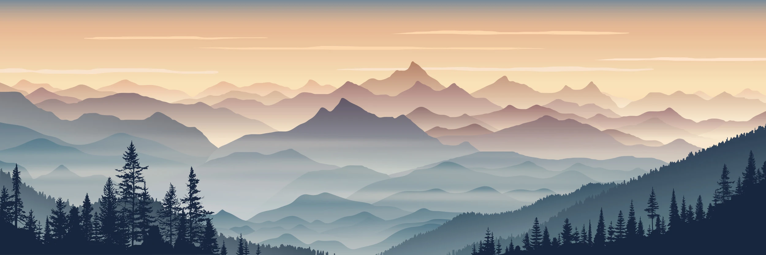 Ce papier peint panoramique montagnard révèle un paysage d’une beauté saisissante, composé de chaînes montagneuses qui se succèdent à l’infini dans un jeu subtil de perspectives. Les silhouettes de sapins au premier plan se dressent comme des sentinelles sombres, leurs formes élancées contrastant harmonieusement avec la brume matinale qui enveloppe délicatement chaque relief. Cette composition graphique d’inspiration nordique mélange habilement les tons poudrés allant du bleu gris profond aux nuances dorées du ciel, créant une palette chromatique d’une élégance rare. Les effets de transparence et les dégradés vaporeux confèrent à cette scène une dimension presque picturale, évoquant les plus belles aquarelles de paysage.