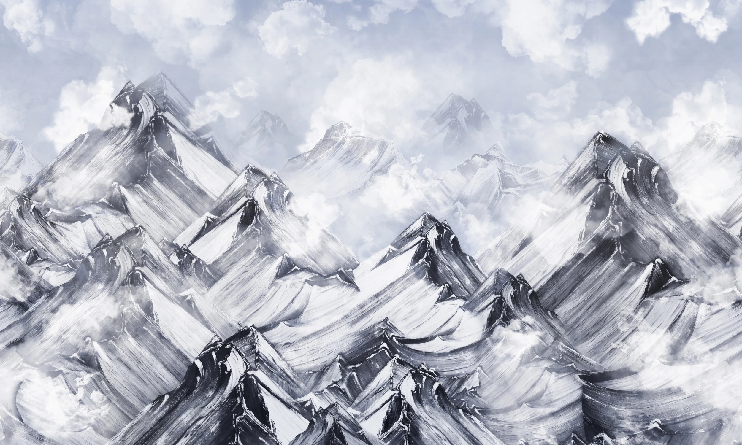 Ce papier peint montagne révèle un panorama époustouflant de sommets enneigés qui s’étendent à perte de vue, créant une fresque naturelle d’une rare intensité. Le style pictural, évoquant la peinture à l’huile traditionnelle, capture avec une précision remarquable les jeux d’ombre et de lumière sur les faces rocheuses. Les tons monochrome oscillent entre le blanc immaculé des neiges éternelles et les gris profonds des parois rocheuses, ponctuées de nuances ardoise qui confèrent une profondeur saisissante à l’ensemble. Les nuages voluptueux semblent danser entre les pics, créant une atmosphère mystérieuse et contemplative qui invite au voyage intérieur.
