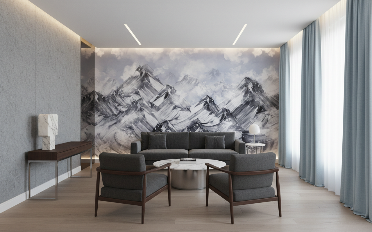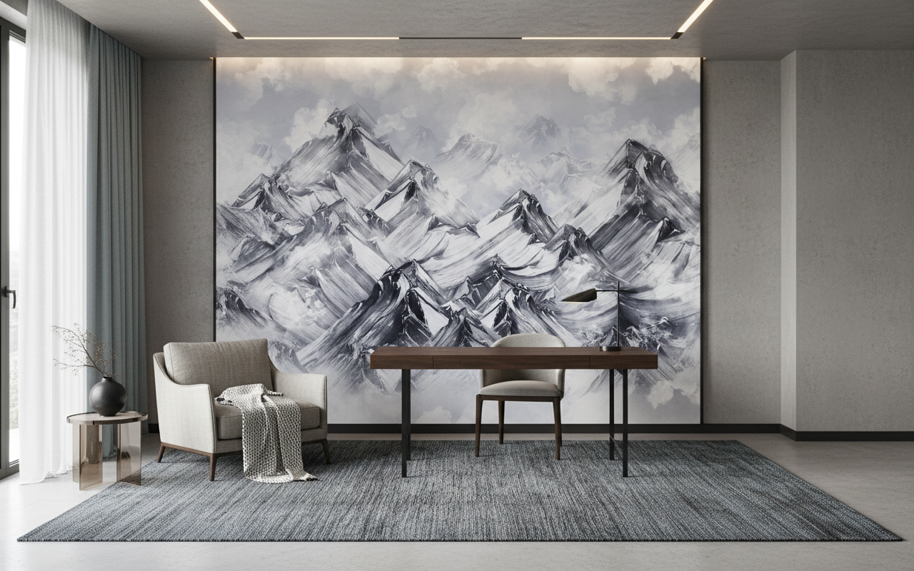 Ce papier peint noir et blanc trouve sa place idéale dans un salon contemporain où il créera un point focal saisissant derrière un canapé en cuir ou en lin naturel. Dans une chambre parentale, il apportera une dimension zen et apaisante, particulièrement harmonieux avec du mobilier en bois clair et des textiles dans les tons beige ou blanc cassé. Pour un bureau, cette fresque montagnarde stimulera l’inspiration tout en conservant une élégance sobre. Associez-le à des matières brutes comme le bois flotté, des métaux patinés ou des tissages naturels pour créer un univers authentique et raffiné. Les teintes complémentaires idéales incluent les tons terre, le blanc pur et les touches de laiton ancien.