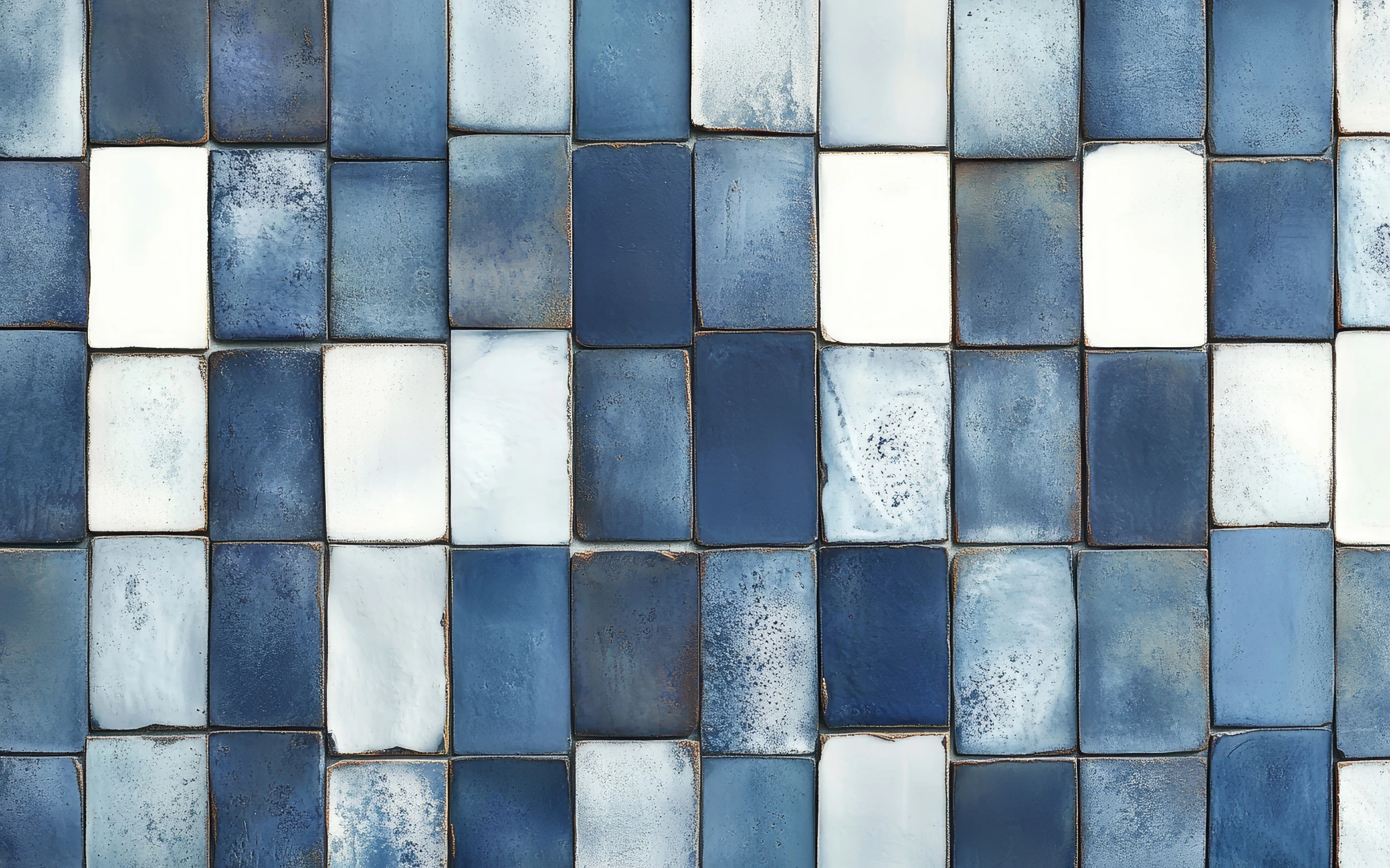 Le style graphique réaliste de ce papier peint capture avec une précision saisissante l’aspect tactile des céramiques artisanales. Les joints vieillis et les irrégularités naturelles de chaque élément confèrent à l’ensemble une authenticité troublante, comme si ces carreaux avaient été posés par les mains expertes d’un artisan traditionnel. La palette chromatique oscille entre les bleus océan, les bleus ardoise et les blancs poudrés, créant une harmonie colorielle d’une douceur apaisante.