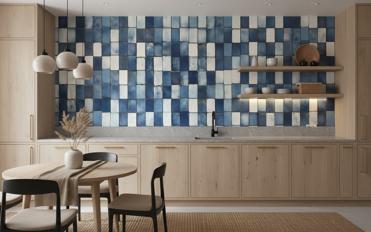 Ce papier peint carrelage bleu trouvera naturellement sa place dans une salle de bains contemporaine, où il créera un cocon de bien-être digne des plus beaux spas. Dans une cuisine moderne, il formera un crédence décorative d’exception, apportant caractère et personnalité à cet espace de convivialité. Pour un salon bohème chic, ce revêtement mural s’harmonisera parfaitement avec du mobilier en bois flotté, des textiles en lin naturel et des accessoires en laiton brossé. Les tons terreux comme l’ocre, le sable et le beige créeront des associations chromatiques d’une élégance naturelle.