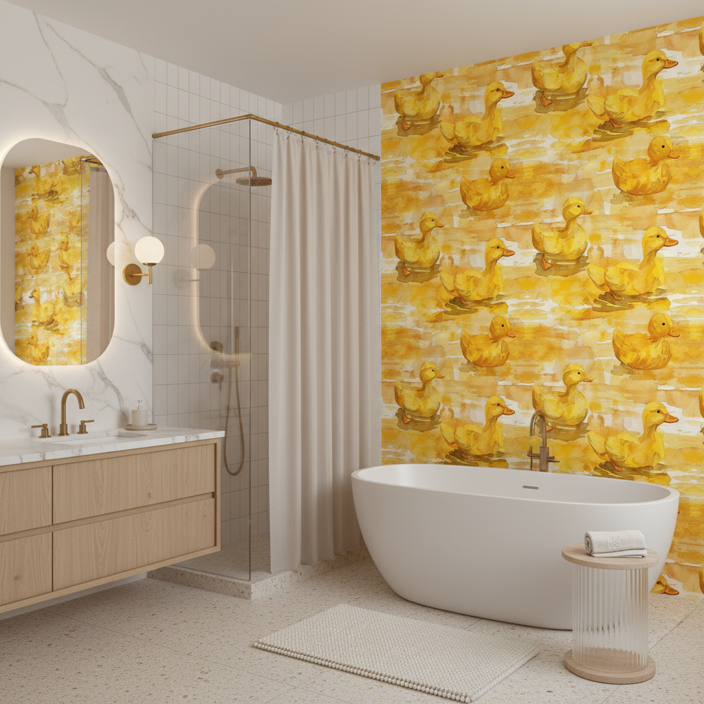 Cette création artistique révèle de charmants canards dorés évoluant gracieusement dans leur environnement aquatique naturel. Réalisé dans un style aquarelle moderne, ce motif animalier présente des palmipèdes aux formes généreuses et bienveillantes, peints avec une délicatesse remarquable. Les tons jaune miel et ocre chaleureux dominent cette composition, créant une harmonie chromatique apaisante qui évoque les derniers rayons du soleil couchant sur un étang paisible. Les nuances dorées se déclinent en subtiles variations, des jaunes pastel les plus tendres aux ambrés les plus profonds, conférant à l’ensemble une richesse visuelle exceptionnelle.