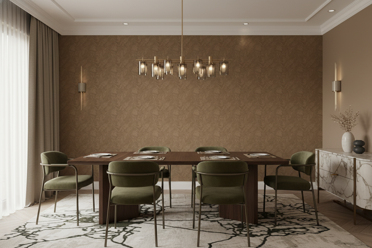 Pour une décoration d’intérieur haut de gamme, ce revêtement mural artistique se mariera avec des teintes complémentaires : vert olive profond, bleu nuit ou rouge cardinal. L’intégration d’œuvres d’art encadrées et de tapis persans parachèvera cette ambiance de luxe discret
