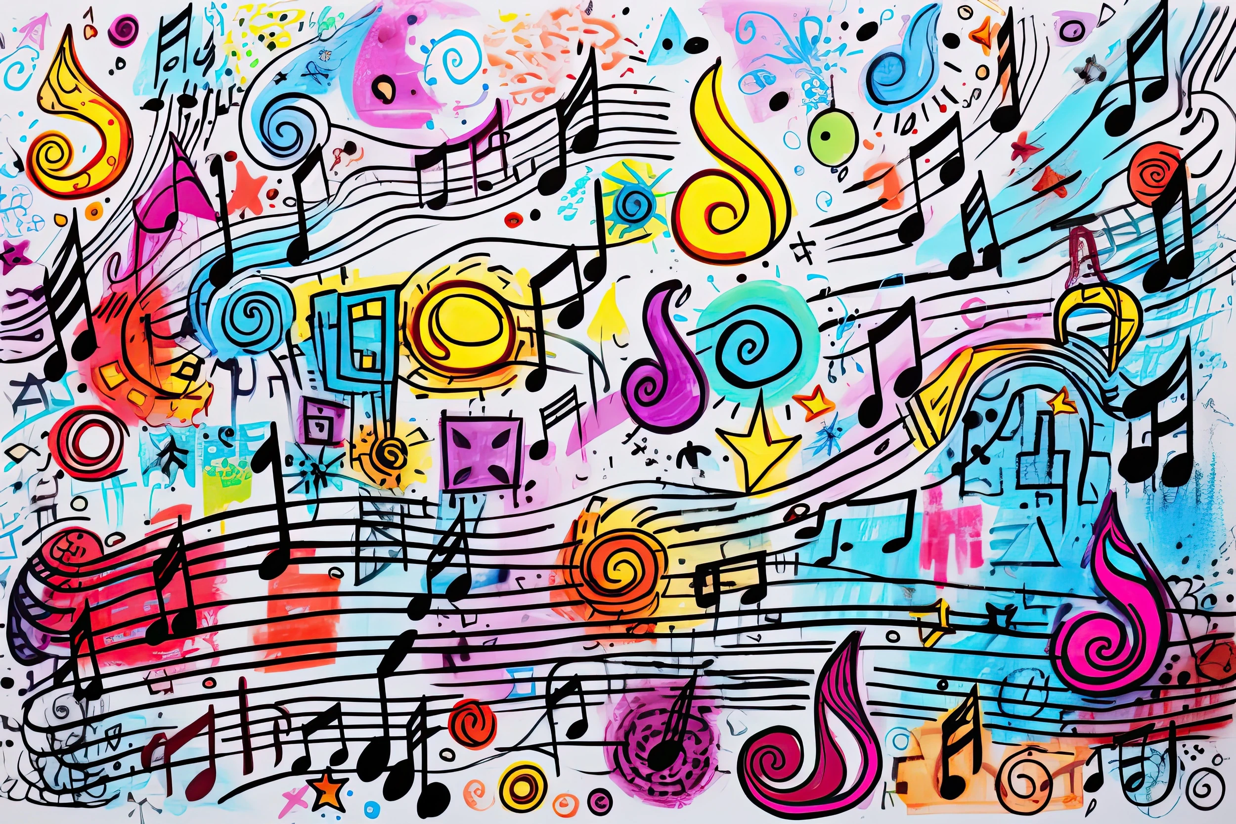 Ce papier peint musical extraordinaire révèle un univers graphique d’une richesse inouïe, où notes de musique noires s’entremêlent à des portées ondulantes dans un ballet chorégraphié avec maestria. Les clés de sol majestueuses, aux courbes dorées et flamboyantes, ponctuent cette composition de leurs spirales hypnotiques. Des formes géométriques colorées – cercles turquoise, carrés magenta, triangles émeraude – surgissent comme des éclats de lumière sur cette toile musicale. L’ensemble s’épanouit dans un style graffiti contemporain, mêlant l’art urbain à l’univers classique de la musique, créant une fusion artistique saisissante.