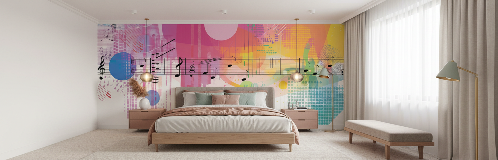 Parfait pour habiller un studio de musique, une chambre d’adolescent mélomane ou un salon contemporain, ce papier peint s’intègre magnifiquement dans les intérieurs modernes et créatifs. Dans un bureau créatif, il stimulera l’inspiration, tandis qu’en tête de lit dans une chambre parentale, il apportera une touche d’originalité sophistiquée. Associez-le à des meubles aux lignes épurées en bois clair ou en métal brossé, à des textiles dans des tons neutres comme le blanc cassé ou le gris perle pour laisser la palette colorée s’exprimer pleinement.