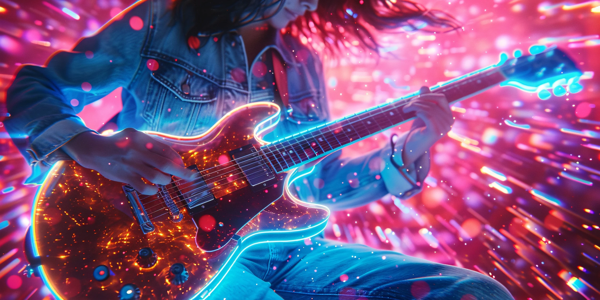 Ce papier peint musical capture l’essence d’un concert électrique avec un réalisme saisissant. Au cœur de la composition, une guitare électrique aux reflets cuivrés et orangés flamboie littéralement, ses cordes vibrant d’une intensité palpable. Les mains du musicien, vêtu d’une veste en jean vintage, caressent l’instrument avec une passion communicative. L’ensemble baigne dans une atmosphère cyberpunk où dominent les tons roses fuchsia, bleus électriques et oranges incandescents. Des particules lumineuses et des traînées néon créent un effet de mouvement hypnotique, comme si la musique elle-même prenait forme visuelle. Le style graphique mélange habilement photographie et effets digitaux, créant une esthétique résolument contemporaine et futuriste.