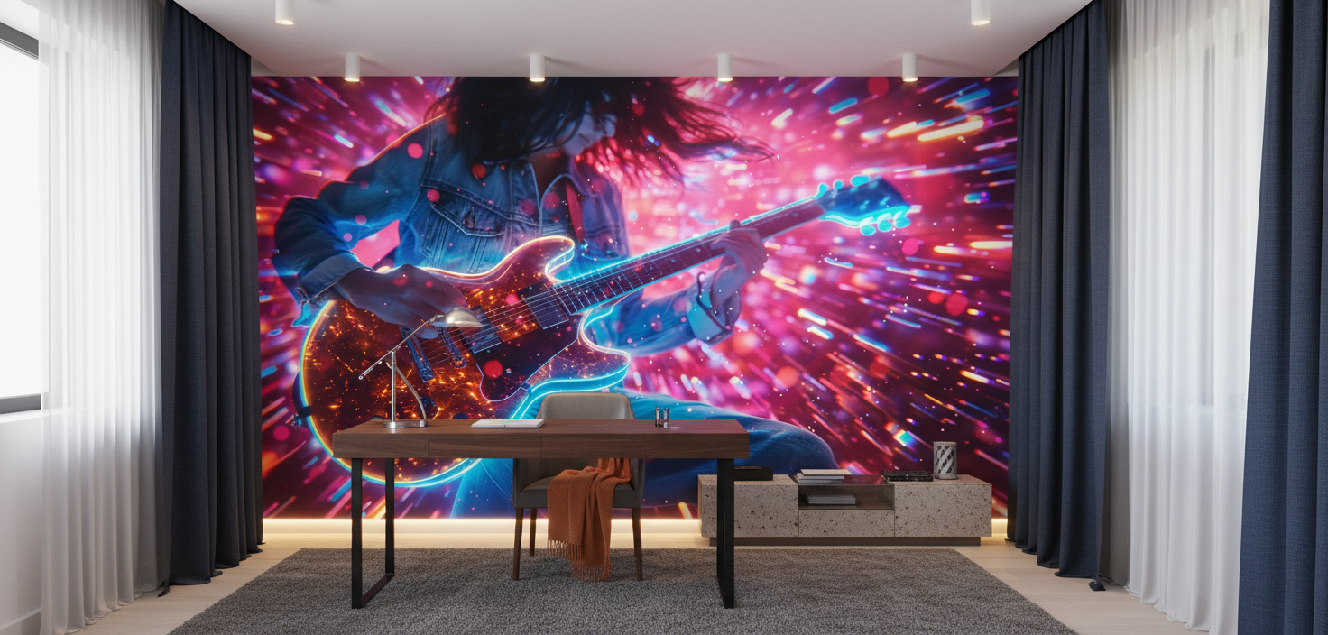 Ce papier peint design trouvera sa place idéale dans un studio de musique, une chambre d’adolescent passionné de rock, un salon moderne aux accents industriels ou encore un home studio. Pour sublimer cette décoration audacieuse, associez-la à du mobilier aux lignes épurées dans des matériaux bruts comme l’acier brossé, le cuir noir ou le bois sombre. Les accessoires métalliques cuivrés ou dorés feront écho aux reflets de la guitare, tandis que des éclairages LED colorés prolongeront l’ambiance néon. Complétez l’ensemble avec des textiles aux textures urbaines : coussins en similicuir, plaids en fausse fourrure noire, ou tapis à poils ras dans les tons anthracite.