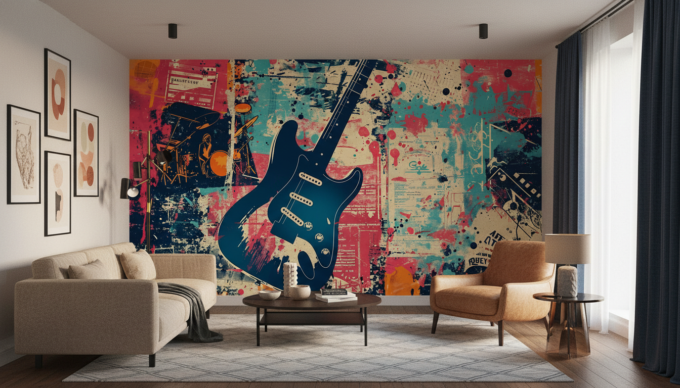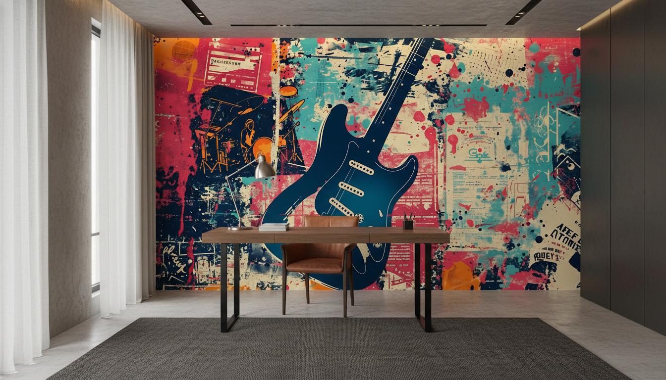 Ce papier peint artistique trouvera parfaitement sa place dans un studio de musique, une chambre d’adolescent passionné de rock, ou encore un salon contemporain en tant que mur d’accent spectaculaire. Dans un bureau créatif ou un espace de travail artistique, il stimulera l’inspiration quotidienne. Associez-le à du mobilier industriel en métal noir, des étagères en bois brut pour exposer vos vinyles, et des coussins en cuir vieilli. Les matières authentiques comme le métal patiné, le bois récupéré et le cuir complèteront parfaitement cette ambiance loft urbain.