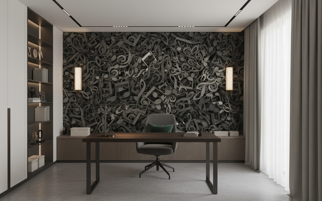 Ce papier peint décoratif musical trouve sa place idéale dans un bureau où il stimulera l’inspiration, une salle de musique où il créera une atmosphère professionnelle, ou encore un salon contemporain en accent wall pour apporter une touche artistique sophistiquée. Dans une chambre d’adolescent passionné de musique, il créera un cocon créatif unique. Pour sublimer cette décoration murale, associez-la à du mobilier en bois sombre comme l’ébène ou le wengé, qui rappellent les instruments classiques. Des touches de cuivre ou de laiton évoquant les cuivres orchestraux s’harmoniseront parfaitement. Côté textile, privilégiez le velours anthracite ou le lin naturel pour créer un équilibre entre modernité et chaleur.