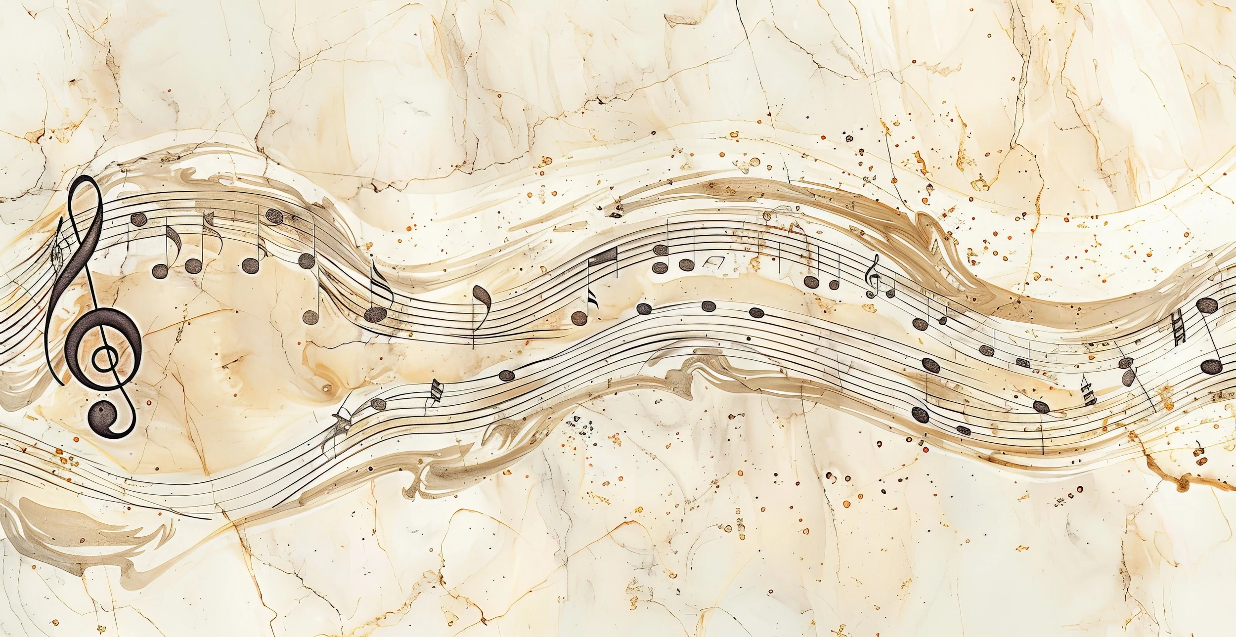 La technique graphique rappelle l’art de l’aquarelle vintage, avec ses taches organiques et ses effets de matière vieillie. Cette esthétique rétro sophistiquée évoque les partitions anciennes, les salons de musique d’époque et l’atmosphère feutrée des bibliothèques musicales. Les nuances beiges et dorées créent une harmonie chromatique apaisante, où chaque élément graphique trouve sa place dans cette mélodie visuelle.