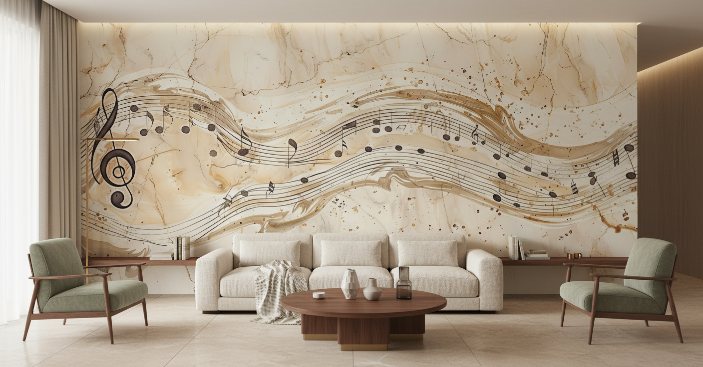 Laissez-vous envoûter par cette symphonie visuelle où les notes de musique s’échappent en volutes dorées, transformant vos murs en une partition géante aux accents vintage sublimes.