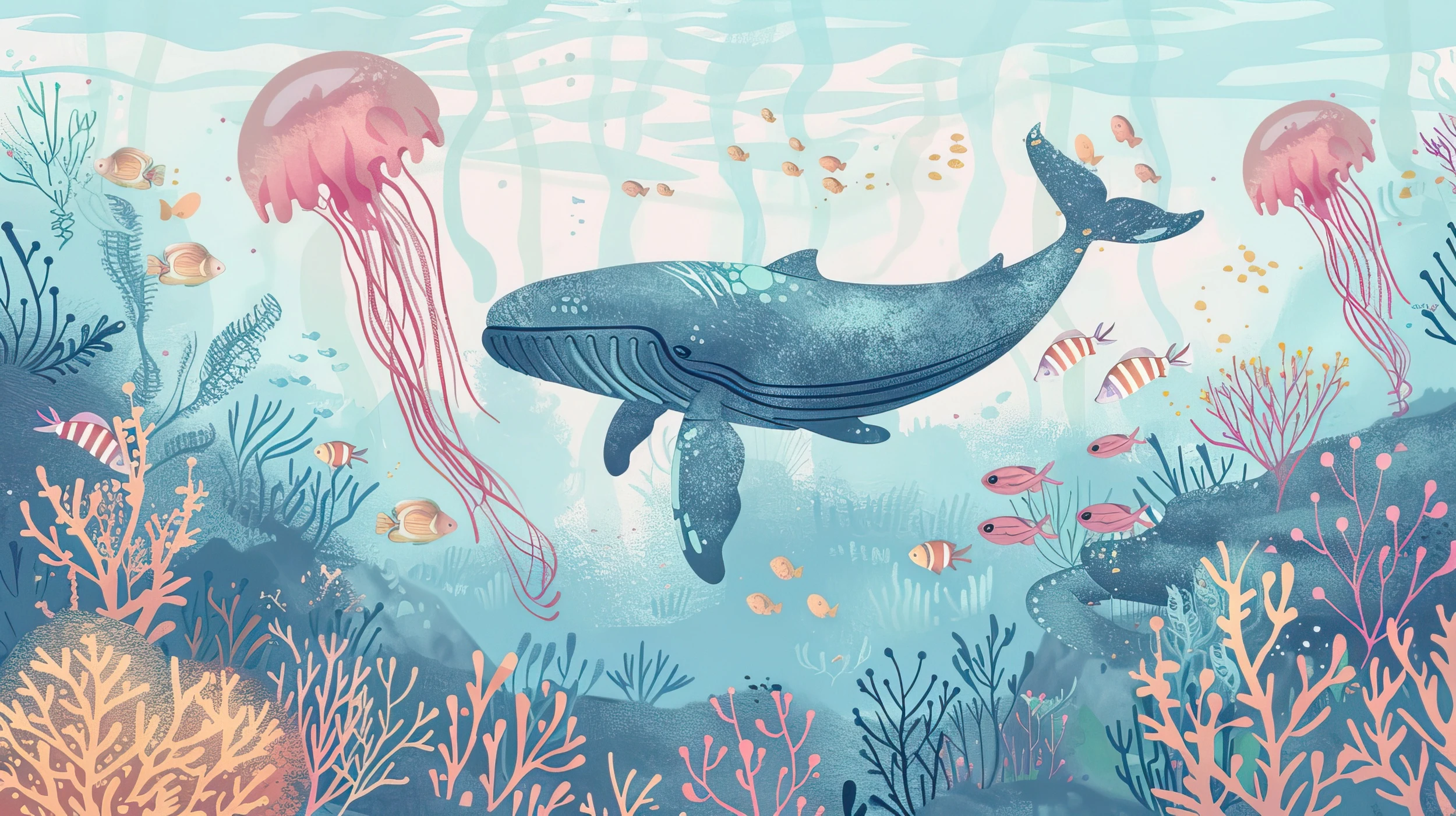 Cette fresque aquatique déploie un univers marin d’une richesse extraordinaire, où une majestueuse baleine bleue aux reflets nacrés évolue gracieusement au cœur d’un écosystème luxuriant. Les méduses roses aux tentacules délicats dansent comme des ballerines éthérées, tandis qu’une multitude de poissons tropicaux aux teintes dorées et corail animent cette symphonie sous-marine. Le style graphique, d’une finesse remarquable, mélange habilement les techniques d’aquarelle moderne et d’illustration naturaliste, créant un rendu à la fois réaliste et poétique.