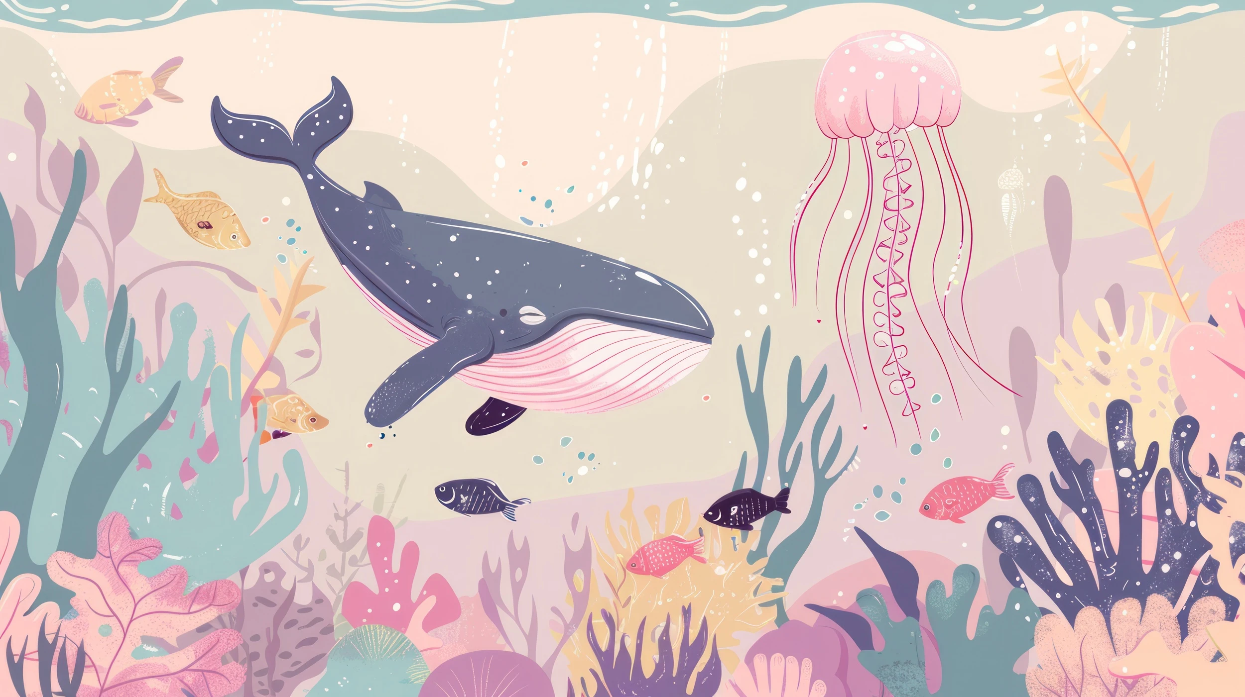 Ce papier peint océanique révèle un univers marin d’une richesse extraordinaire, où une baleine majestueuse aux tons bleu nuit ponctués de blanc navigue gracieusement parmi un écosystème coloré. Sa silhouette imposante, ornée de motifs stellaires délicats, côtoie une méduse rose translucide aux tentacules ondoyants qui semble danser dans les courants invisibles. L’illustration de style aquarelle moderne mêle subtilement réalisme et fantaisie, créant une atmosphère à la fois douce et mystérieuse.