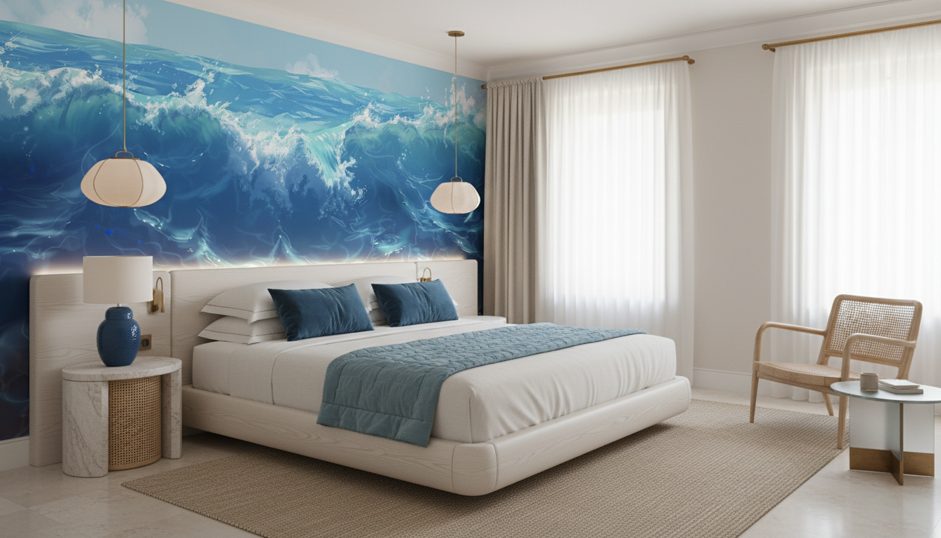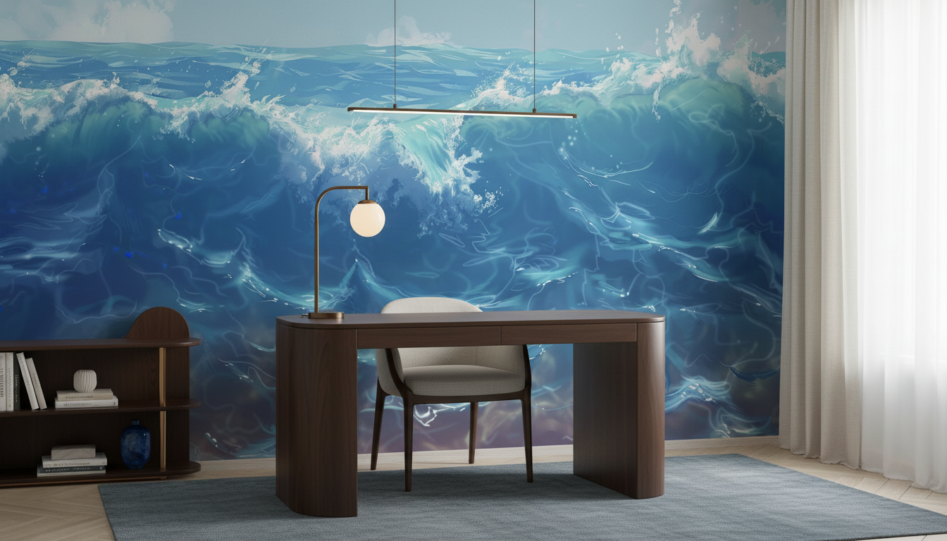 Ce papier peint bleu océan trouve sa place idéale dans un salon contemporain où il habillera un mur d’accent avec prestance, créant un point focal spectaculaire. Dans une chambre parentale, il transforme l’espace en un cocon apaisant propice à la détente. Les bureaux et espaces de travail bénéficient également de cette évasion marine qui stimule la créativité. Pour sublimer cette ambiance océanique, associez-le à du mobilier en bois flotté, des textiles en lin naturel et des accessoires en laiton patiné. Les teintes blanc cassé, gris perle et beige sable créent une harmonie parfaite, tandis que quelques touches de corail ou de vert-de-gris évoquent les trésors marins.