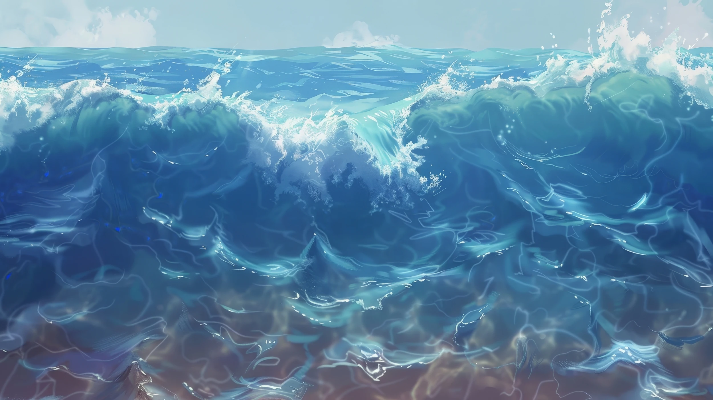 Ce papier peint océan d’exception révèle toute la majesté de la mer dans sa splendeur la plus brute. Les vagues écumantes se dressent en première ligne, sculptées avec un réalisme saisissant qui capture chaque goutte d’écume, chaque reflet cristallin. La palette chromatique navigue entre les bleus profonds des abysses et les turquoises lumineux des eaux tropicales, ponctuée de blancs nacré où la mousse vient danser. Cette œuvre graphique, réalisée dans un style pictural d’une finesse remarquable, évoque l’art de la peinture marine contemporaine avec ses nuances subtiles et ses jeux de transparence aquatique.
