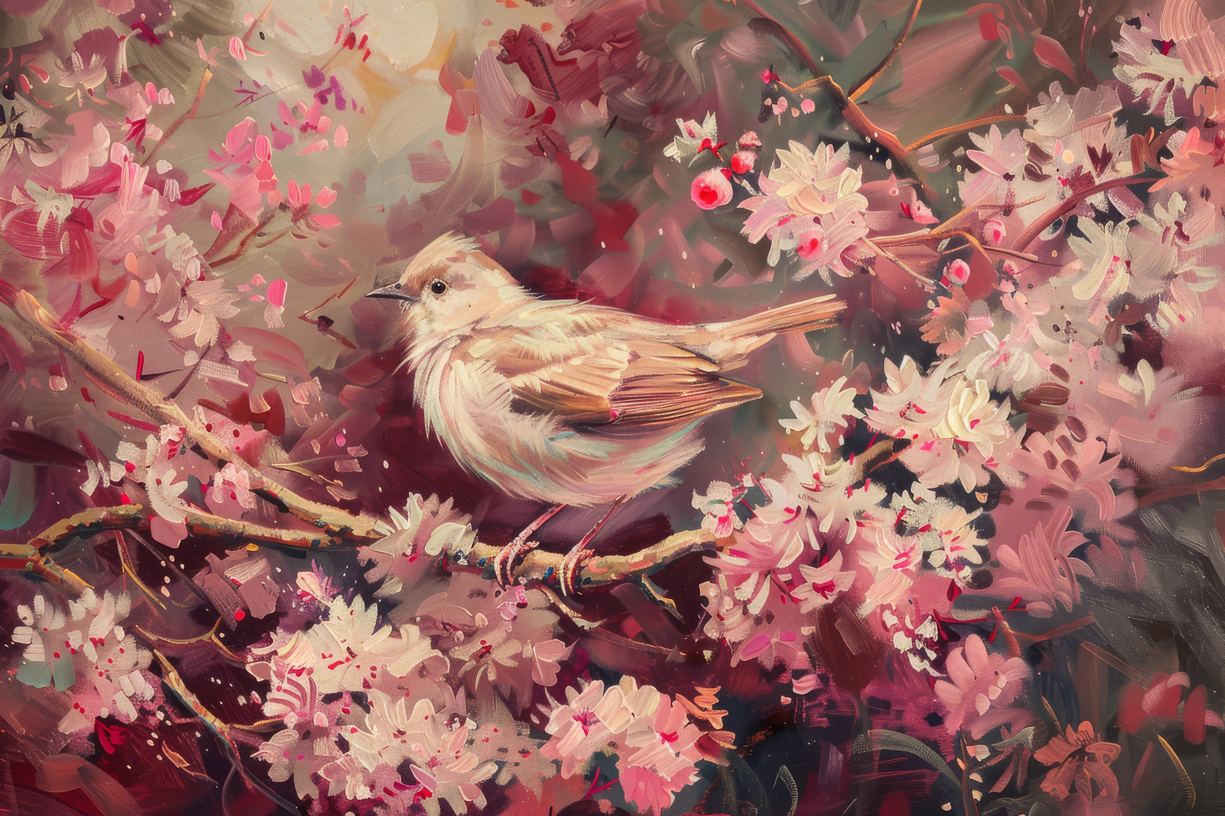 Dans un ballet de pétales roses et de plumes dorées, un petit oiseau délicat se love au cœur d’un jardin impressionniste, où chaque coup de pinceau révèle la poésie d’un printemps éternel.