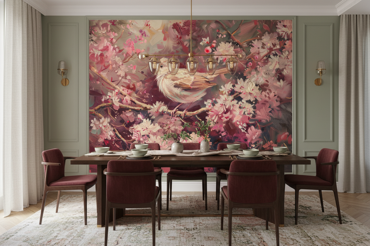 Cette œuvre murale insuffle instantanément une atmosphère romantique et apaisante dans votre intérieur. L’ambiance qui s’en dégage évoque les jardins japonais au printemps, où la contemplation se mêle à l’émerveillement devant la beauté éphémère de la nature. Ce papier peint floral transforme votre espace en un cocon féerique et chaleureux, invitant à la rêverie et à la détente.