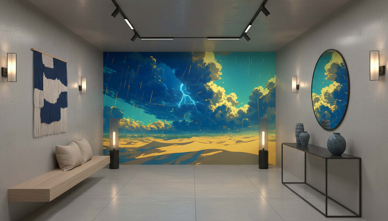 Cette fresque murale panoramique déploie un paysage saisissant où se mêlent la sérénité du désert et la violence sublime de la tempête. Les dunes ondulantes se parent de nuances chaudes, oscillant entre l’ocre doré et le sable lumineux, contrastant magnifiquement avec le ciel dramatique qui les surplombe. Les nuages tourmentés s’étendent en masses imposantes, teintés de bleus profonds et de gris orageux, tandis qu’un éclair électrisant zèbre l’atmosphère de sa lumière blanche et pure.