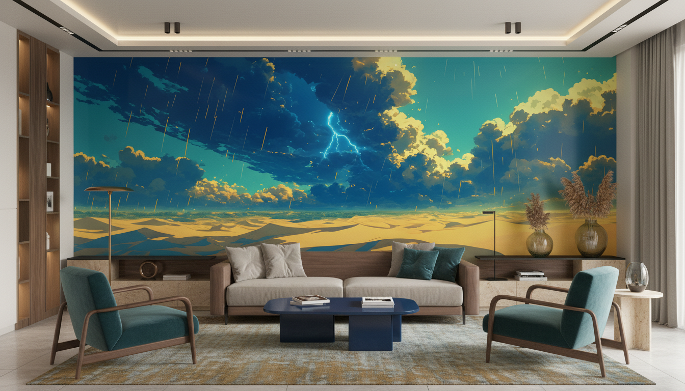 L’art graphique de ce papier peint style digital painting révèle une maîtrise technique exceptionnelle, où chaque détail météorologique prend vie avec un réalisme saisissant. La palette chromatique harmonieuse marie les tons turquoise et céladon du ciel changeant aux jaunes dorés des étendues sablonneuses, créant une symphonie visuelle d’une rare intensité. Les gouttes de pluie stylisées qui strient l’image apportent une dimension cinétique fascinante, comme si la nature elle-même était en mouvement perpétuel.
