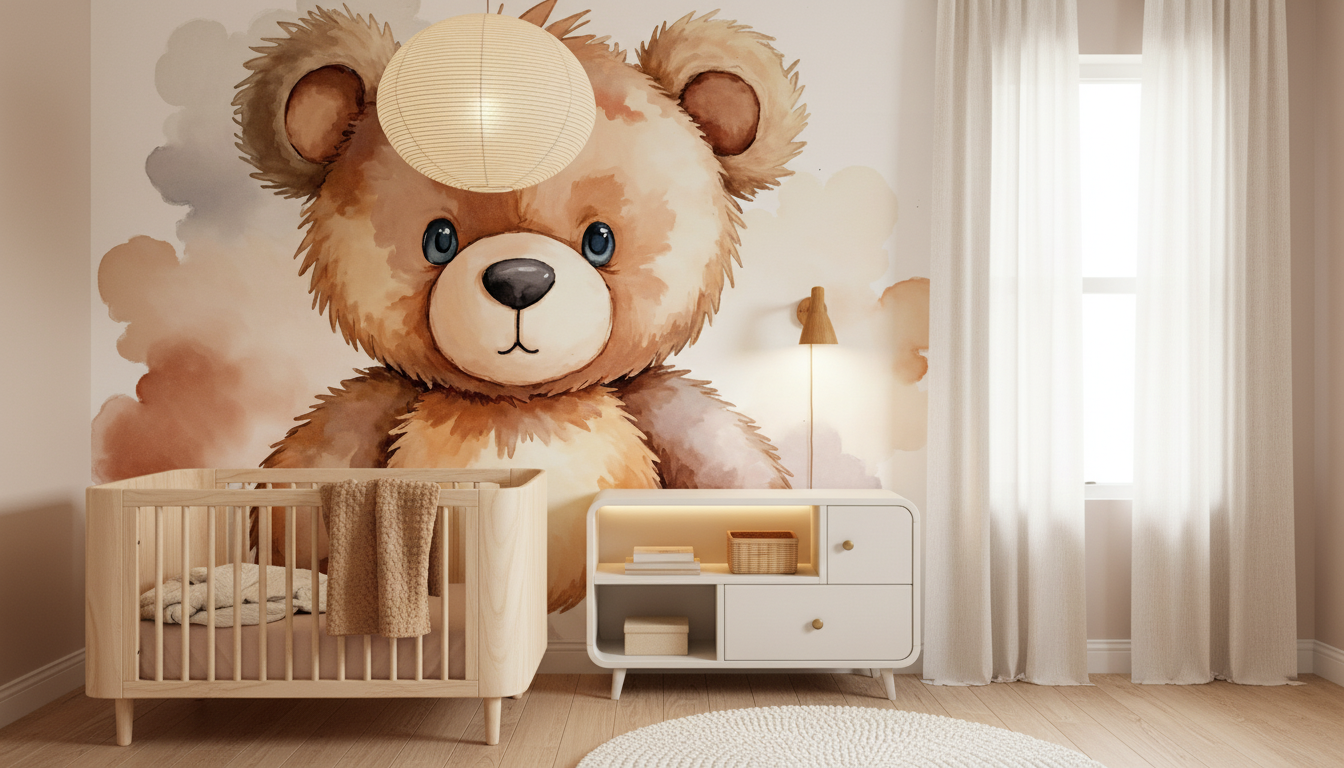 Parfaitement adapté pour habiller une chambre de bébé ou une chambre d’enfant, ce papier peint décoratif animalier trouve également sa place dans un salon cosy ou un coin lecture familial. Associez-le à du mobilier en bois naturel aux finitions poudrées, des textiles en lin écru ou en coton bio, et des accessoires dans les tons crème et beige rosé. Des coussins en velours caramel, un tapis moelleux aux nuances terre de Sienne, et quelques objets décoratifs en rotin tressé compléteront harmonieusement cette ambiance cocooning. Pour les plus audacieux, une touche de bleu poudré en écho aux yeux de l’ourson apportera une note de fraîcheur délicate.