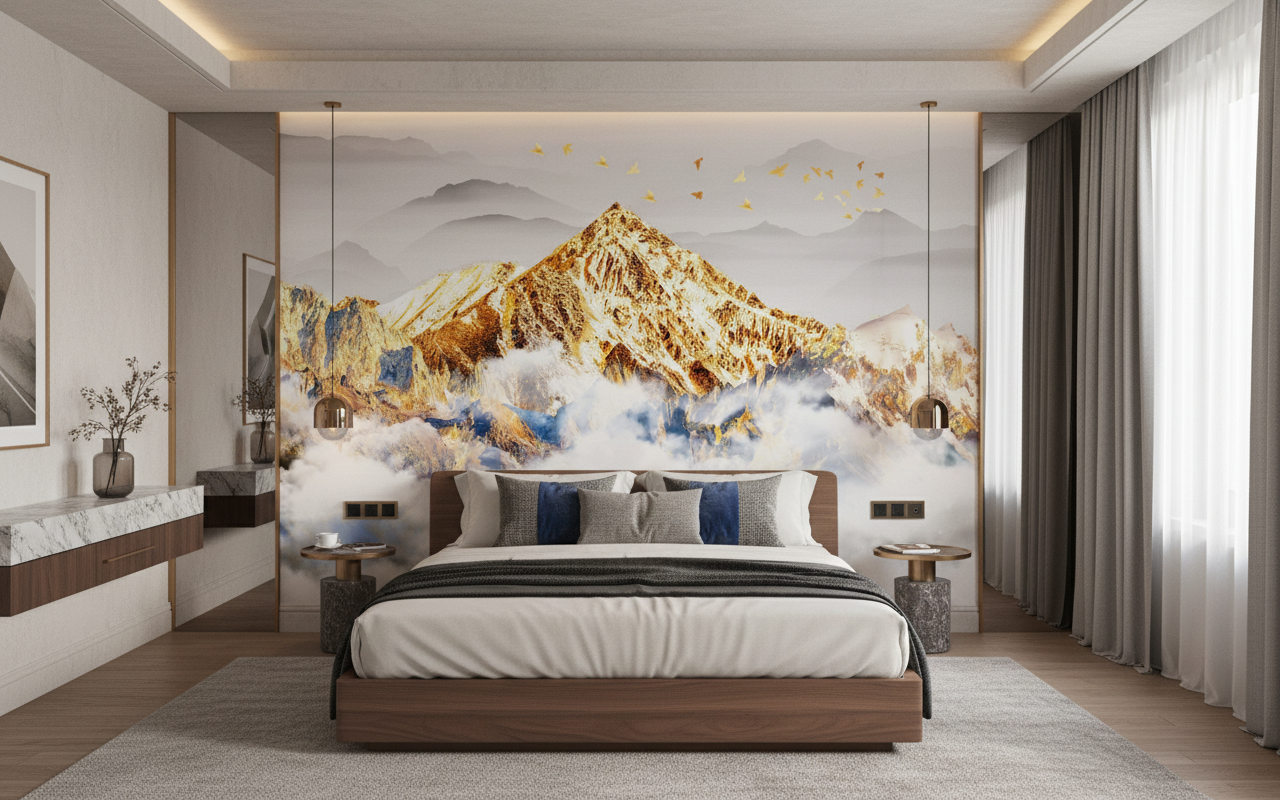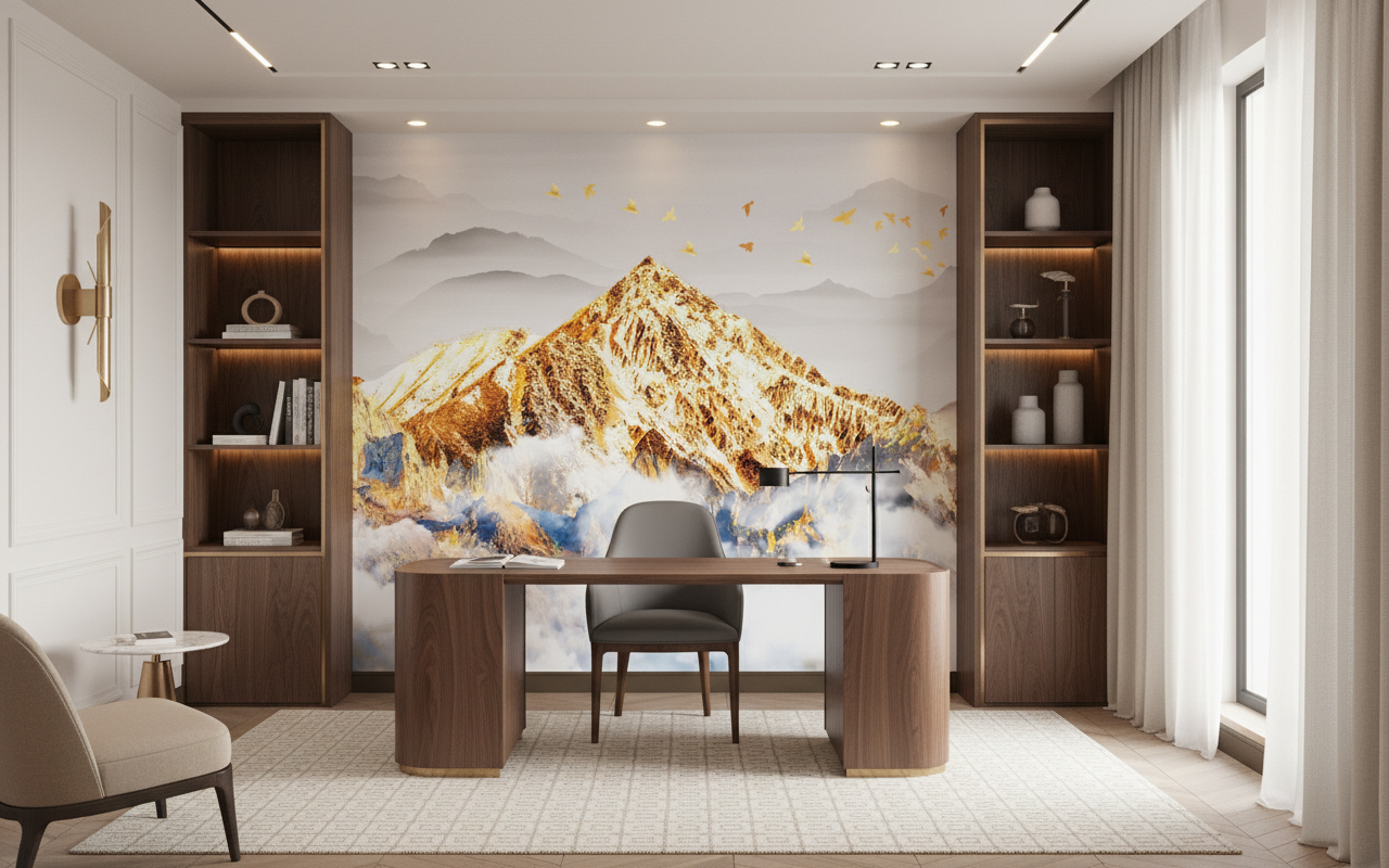 Ce papier peint salon trouvera sa place d’honneur sur le mur principal de votre pièce à vivre, créant un point focal d’une élégance remarquable. Il s’épanouira également dans une chambre parentale en version tête de lit, apportant une dimension apaisante propice au repos. Pour un bureau feng shui, cette représentation des hauteurs favorisera concentration et inspiration créative. Associez-le à un mobilier en bois naturel, des textiles en lin écru ou laine bouclée, et des accessoires déco dans les tons cuivre ou laiton brossé pour une harmonie parfaite. Les plantes vertes aux feuillages graphiques viendront sublimer cette ambiance nature chic.