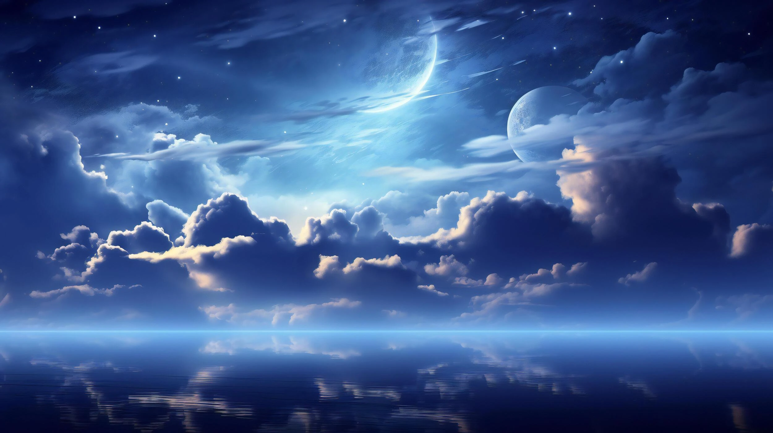 Ce papier peint panoramique dévoile un paysage nocturne d’une poésie extraordinaire, où se mêlent harmonieusement ciel étoilé et océan miroir. Les nuages volumineux aux reflets nacrés flottent majestueusement dans un firmament d’un bleu profond, ponctué d’étoiles scintillantes et sublimé par la présence mystérieuse de planètes lointaines. La lumière lunaire filtre à travers cette symphonie céleste, créant des jeux d’ombres et de lumières d’une subtilité remarquable. En contrebas, les eaux calmes reflètent fidèlement cette voûte étoilée, doublant la magie du spectacle dans un effet miroir hypnotisant.