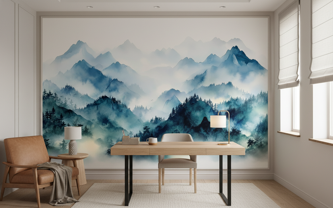 Ce papier peint paysage montagnard révèle un spectacle d’une beauté saisissante : des montagnes brumeuses se déploient en cascades successives, créant une perspective infinie qui semble s’étendre au-delà des murs de votre intérieur. Les reliefs escarpés se parent d’une végétation de conifères aux silhouettes élancées, tandis que les vapeurs nuageuses flottent gracieusement entre les vallées. L’artiste a maîtrisé la technique de l’aquarelle avec une finesse remarquable, créant des dégradés subtils qui évoquent la peinture traditionnelle asiatique. La palette chromatique oscille harmonieusement entre des bleus profonds, des verts émeraude et des tons céladon, ponctuée de blancs nacrés qui apportent une luminosité naturelle à l’ensemble.