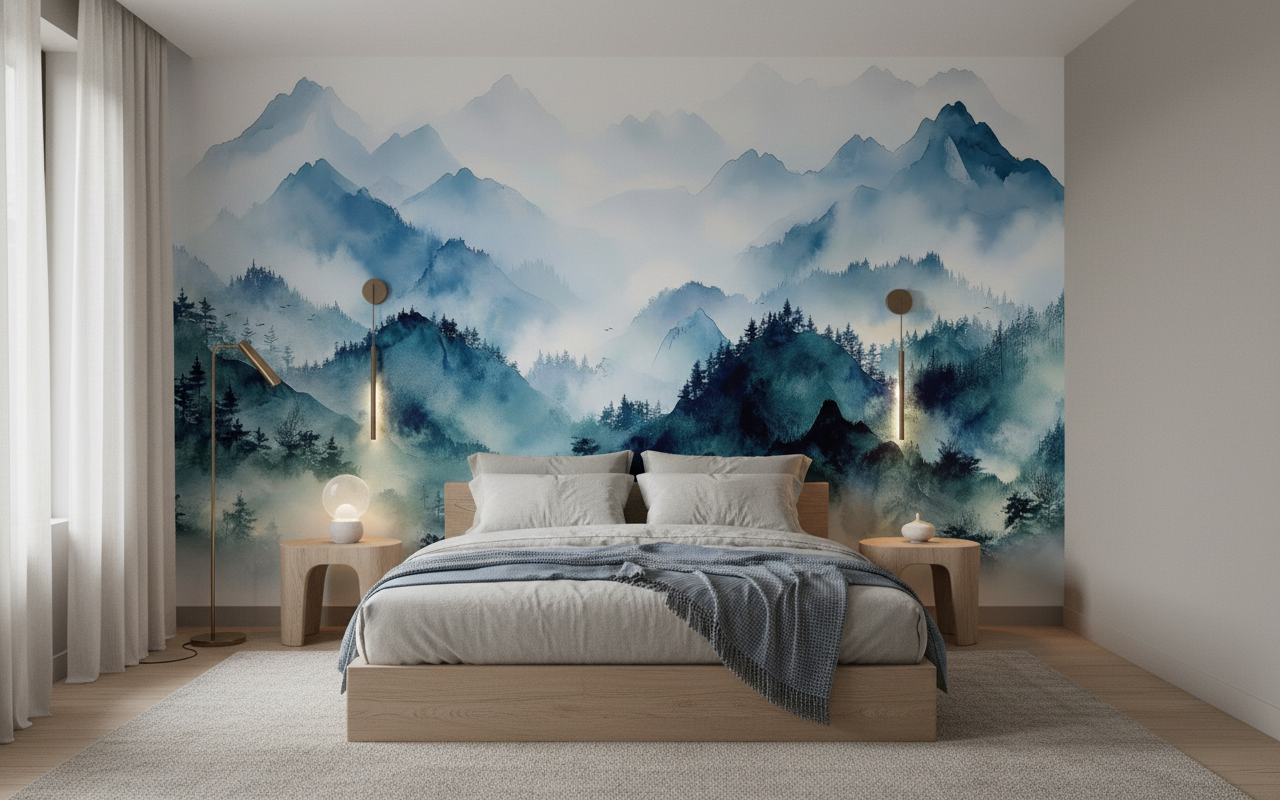 Ce papier peint nature trouvera sa place idéale dans un salon moderne où il constituera un magnifique mur d’accent, dans une chambre parentale pour créer une ambiance reposante propice au sommeil, ou encore dans un bureau pour favoriser la concentration et l’inspiration. Associez cette tapisserie paysage à du mobilier en bois naturel, des textiles en lin écru ou des accessoires en bambou pour amplifier cette connexion avec la nature. Les tons neutres et les matières brutes comme la pierre ou le métal brossé s’harmoniseront parfaitement avec cette esthétique scandinave et minimaliste.
