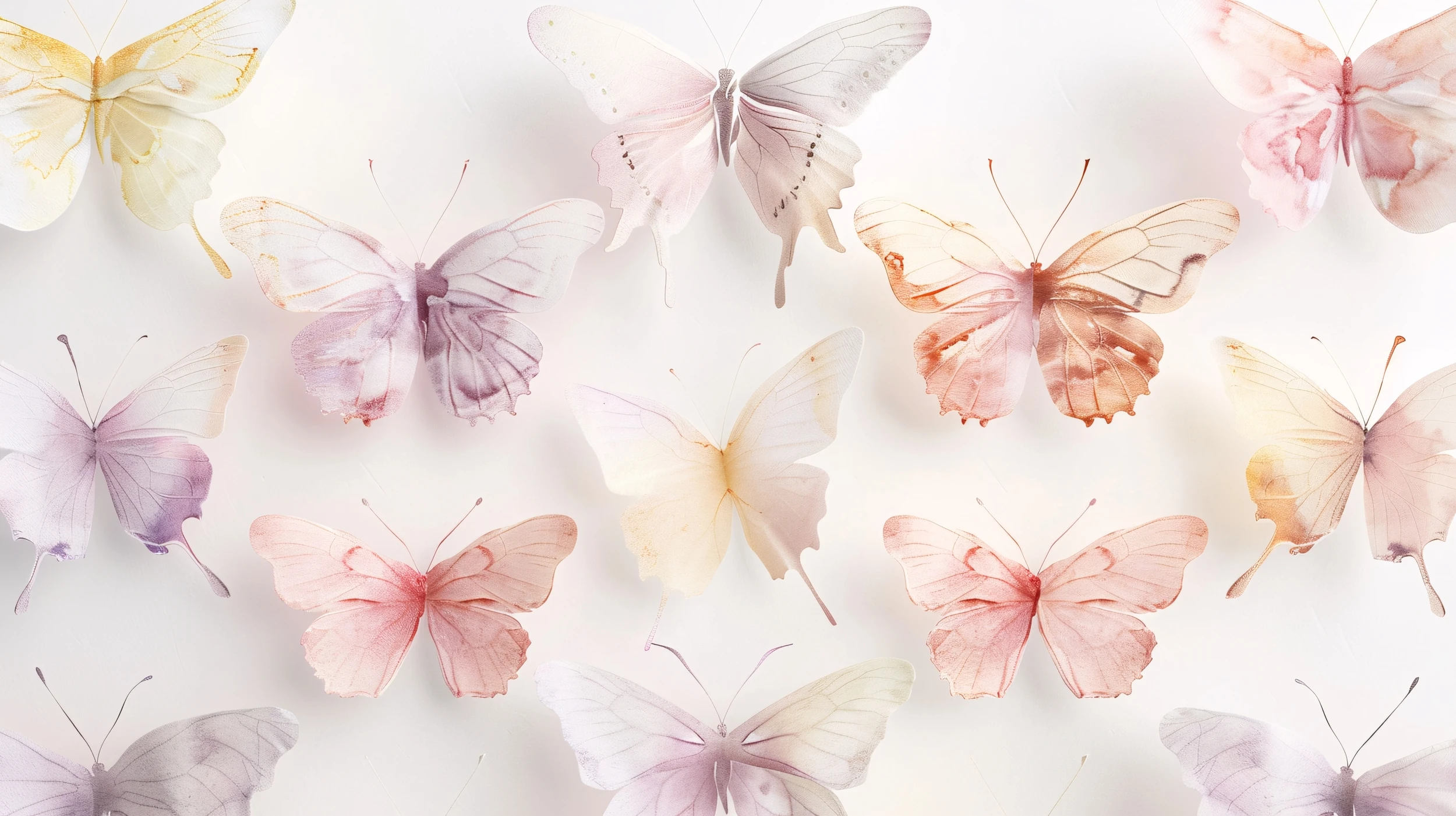 Ce papier peint aux motifs de papillons révèle une collection exquise de lépidoptères aux ailes translucides, peints dans un style aquarelle délicat qui évoque la grâce de l’art botanique du XIXe siècle. Chaque papillon décoratif semble flotter avec une légèreté aérienne sur un fond nacré aux reflets poudrés. Les tons pastel dominent cette composition féerique : rose poudré, lavande tendre, jaune mimosa et blanc crème se mélangent dans des nuances subtiles qui rappellent les premières heures de l’aube. Les ailes, finement veinées et ornées de détails naturalistes, présentent des dégradés chromatiques d’une finesse remarquable, où chaque battement semble suspendu dans un éternel ballet silencieux.
