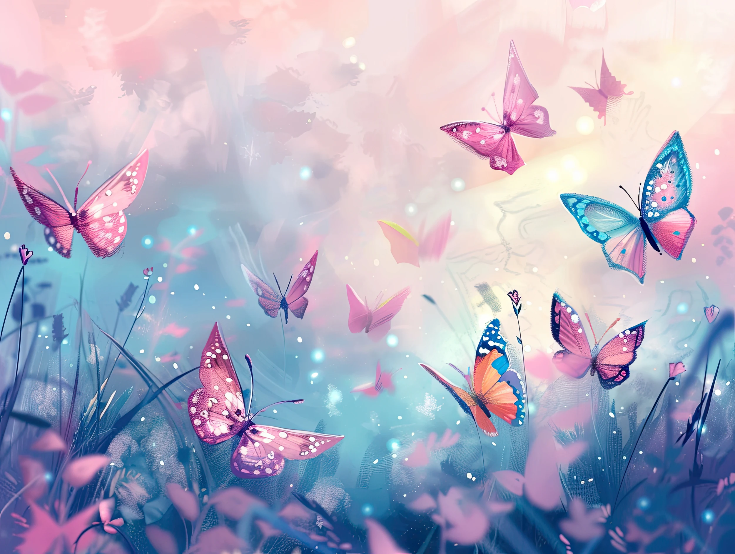 Laissez-vous porter par un souffle de magie où les papillons multicolores dansent dans une symphonie de lumière dorée, créant un ballet féerique suspendu entre rêve et réalité.