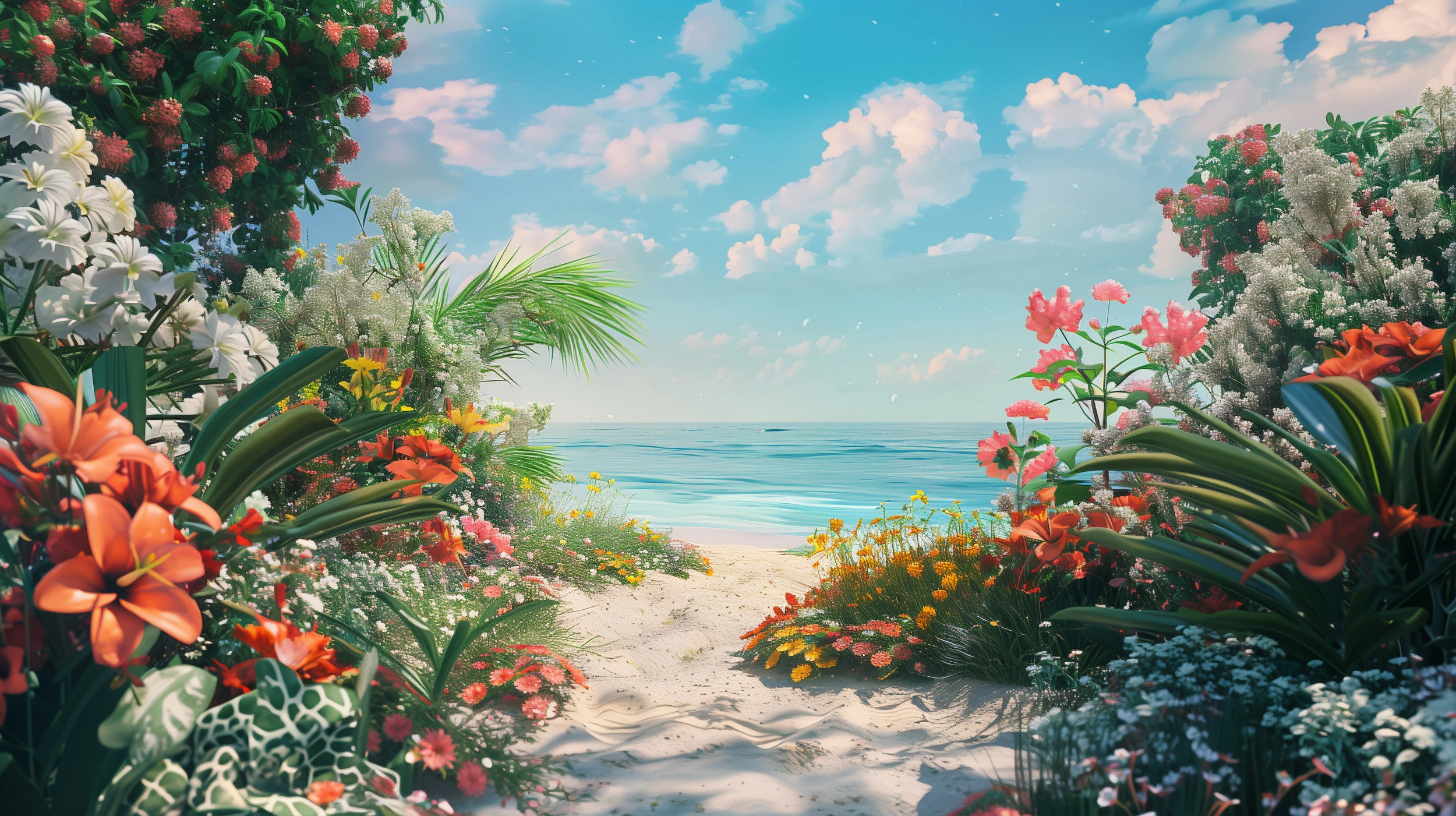 Papier Peint Paradis Tropical Plage Fleurie Vue Océan Turquoise