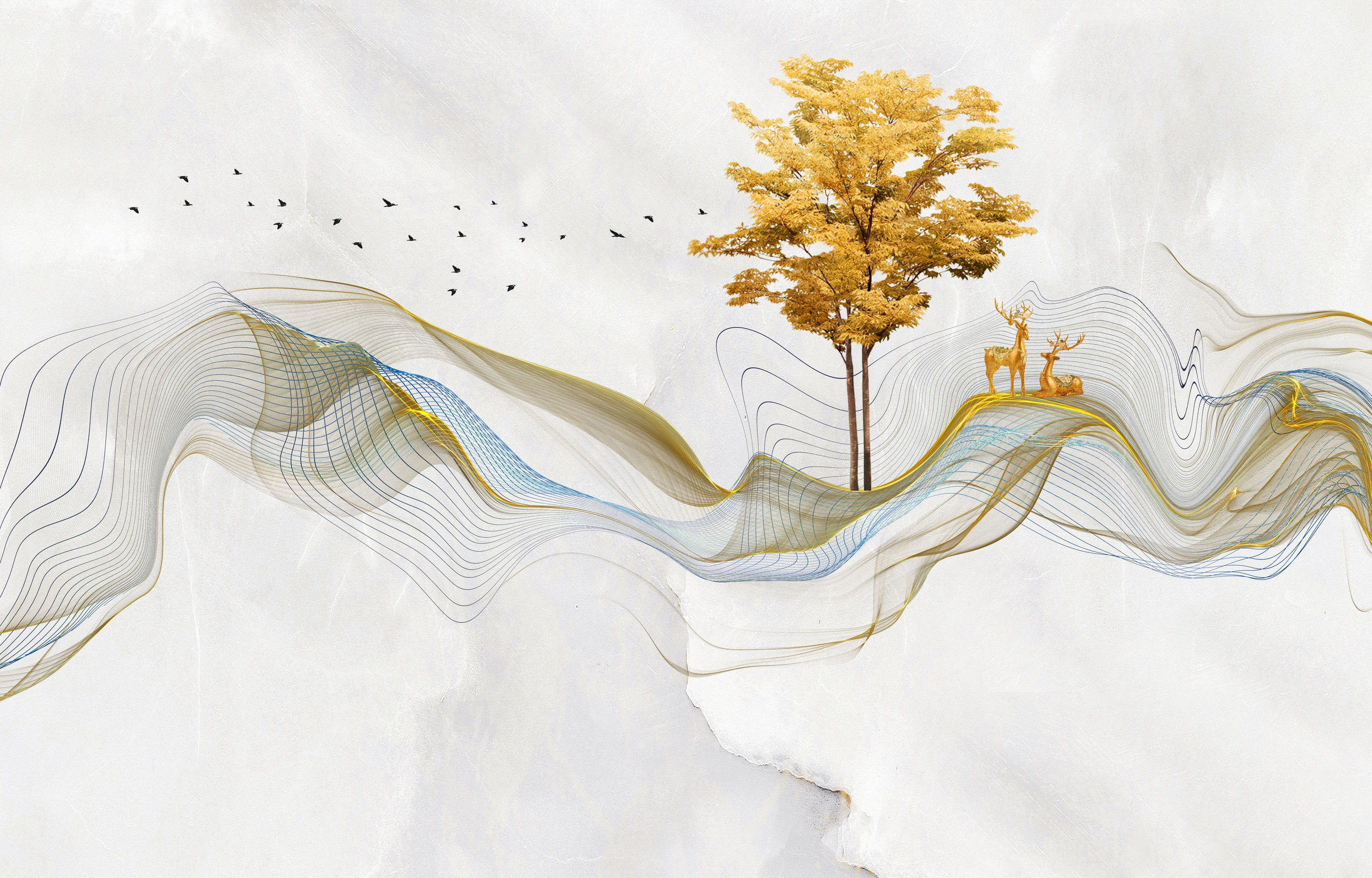 Ce papier peint artistique révèle un univers fascinant où dominent les tons dorés et les nuances cuivrées, sublimés par des accents de bleu tendre qui apportent une fraîcheur subtile à l’ensemble. Au cœur de cette composition, un arbre aux feuillages dorés s’élève majestueusement, ses branches déployées dans une chorégraphie naturelle parfaite. Les silhouettes de cerfs se détachent avec élégance sur les courbes ondulantes, créant une scène bucolique d’une rare poésie. Une volée d’oiseaux traverse ce tableau aérien, apportant mouvement et dynamisme à cette fresque moderne.