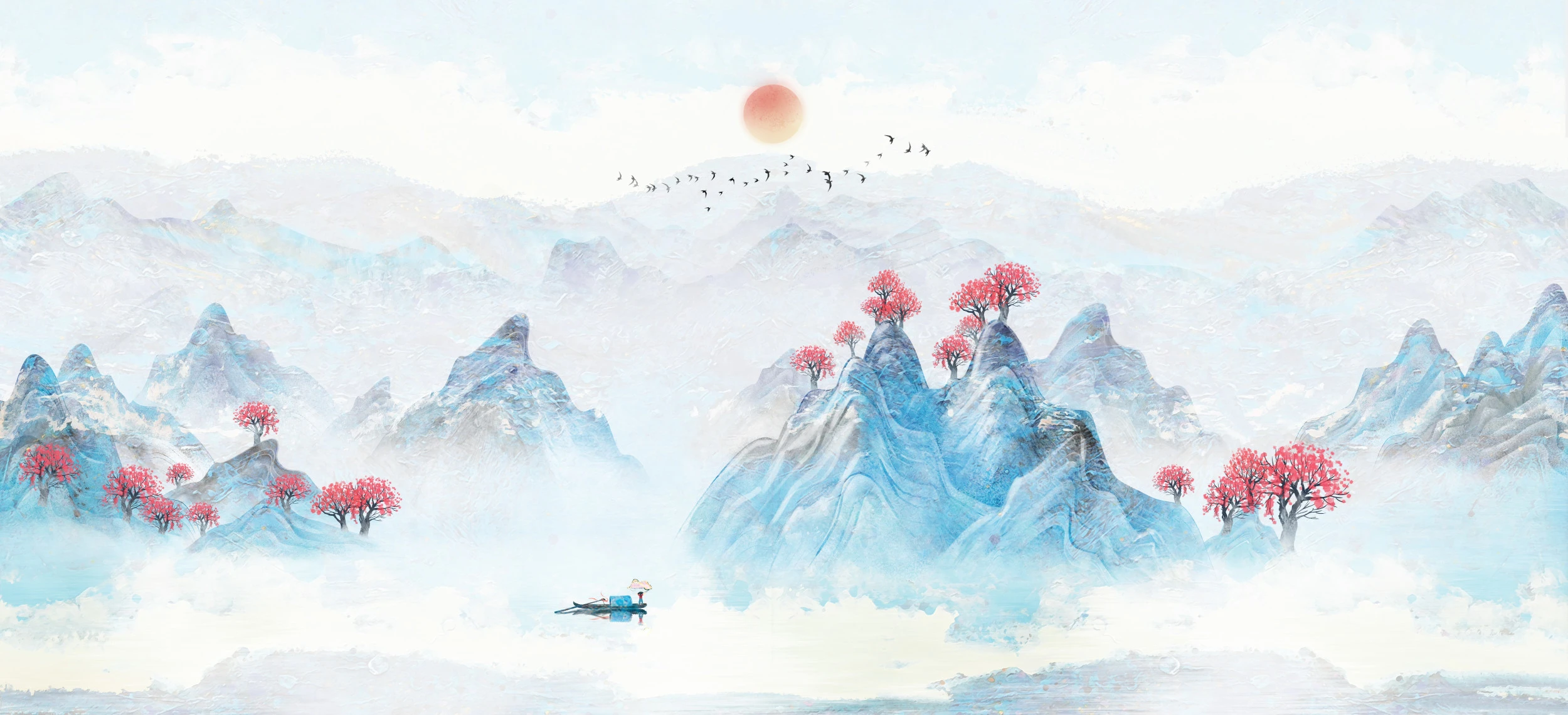 Ce papier peint paysage asiatique capture toute la poésie de l’art traditionnel chinois dans un style aquarelle délicat aux tons poudrés. Les montagnes aux reflets bleus se dressent majestueusement dans la brume matinale, ponctuées de cerisiers en fleurs aux teintes rose corail qui apportent une note de tendresse romantique. Au premier plan, un petit bateau de pêcheur navigue sereinement sur les eaux calmes, tandis qu’une volée d’oiseaux traverse le ciel en formation gracieuse. La palette de couleurs douces mélange harmonieusement les bleus lavande, les roses poudrés et les blancs nacrés, créant une atmosphère d’une sérénité absolue.