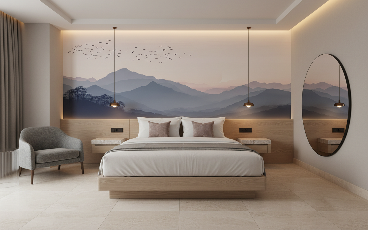 Parfaitement adapté pour habiller le mur principal d’un salon moderne ou d’une chambre parentale, ce papier peint nature se marie harmonieusement avec un mobilier aux lignes épurées et des matières naturelles comme le bois clair, le lin ou la pierre. Dans un bureau, il favorise la concentration tout en apportant une note d’inspiration créative. Associez-le à des textiles blanc cassé et des accessoires en tons neutres pour créer une ambiance cocooning scandinave, ou complétez-le avec des touches de cuivre brossé et de velours gris pour une atmosphère plus sophistiquée.
