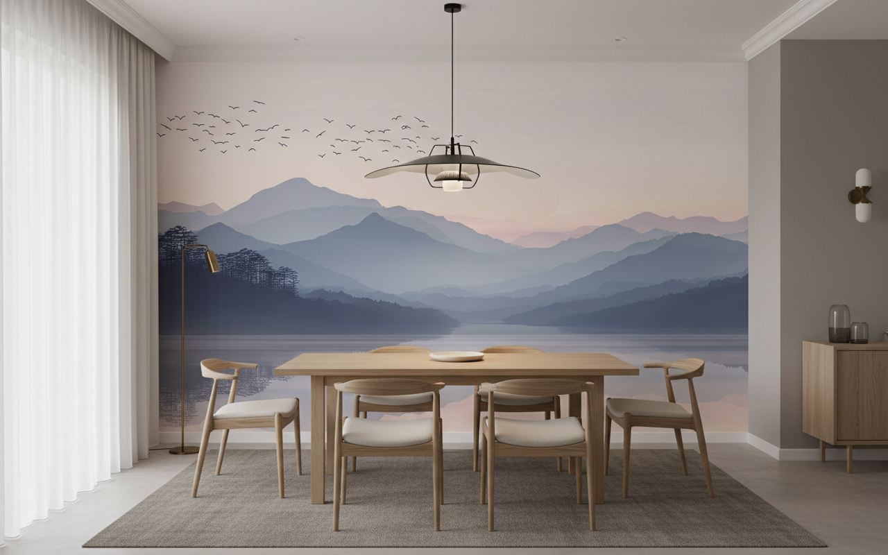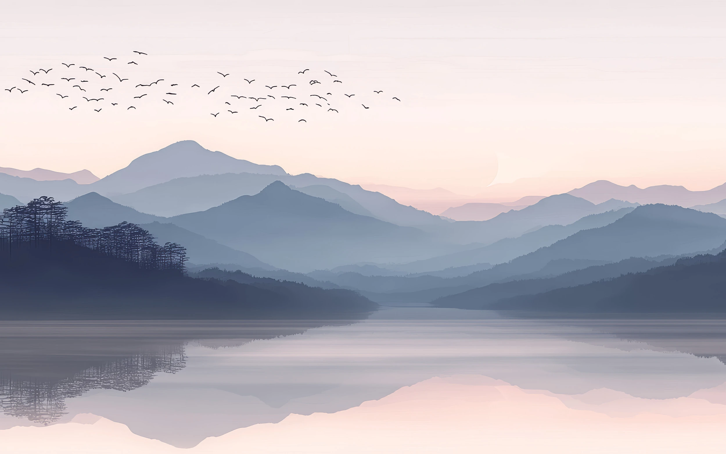 Évadez-vous dans ce paysage montagneux à la sérénité absolue. Ce papier peint sur mesure révèle un lac miroir et des oiseaux migrateurs. Une palette douce de bleu-gris et rose pour un intérieur zen. Créez un havre de paix unique, propice à l’évasion quotidienne.