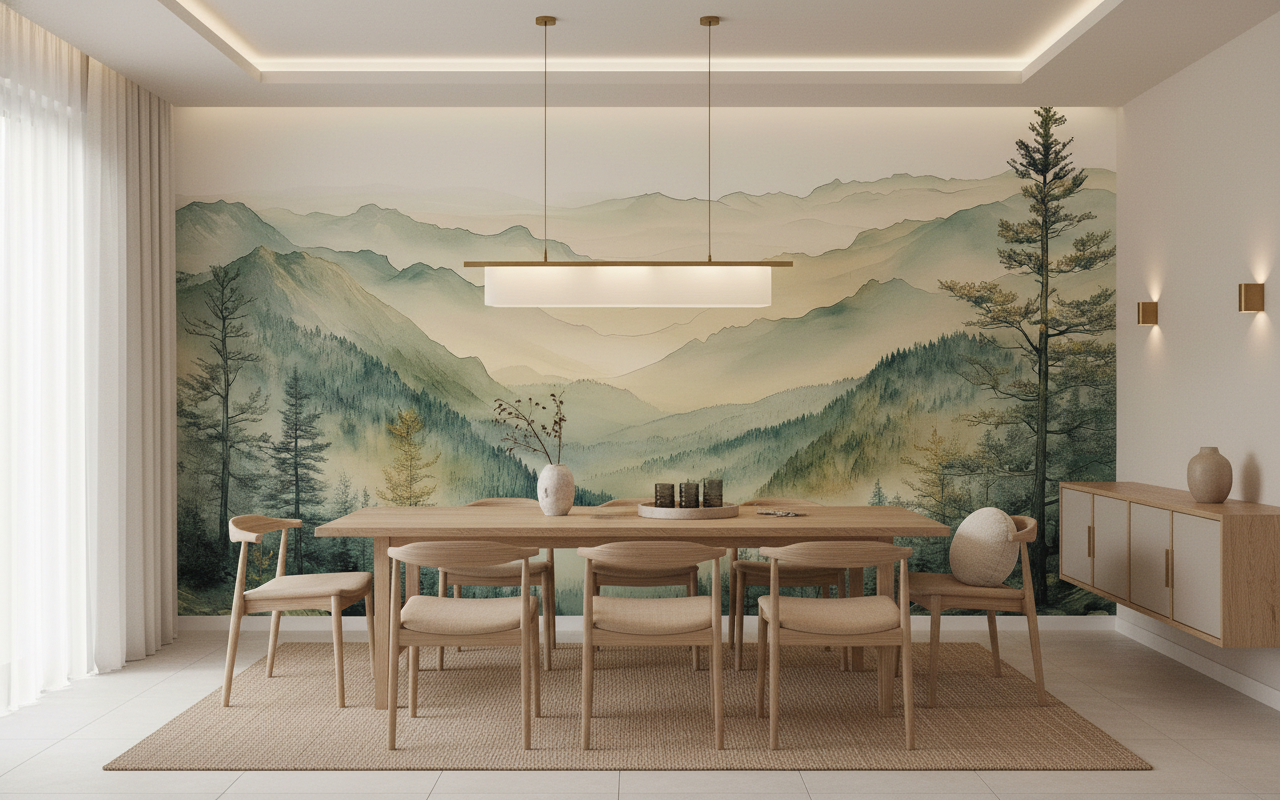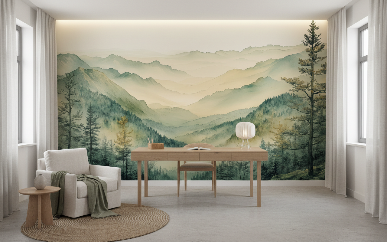 Parfait pour habiller un salon cocooning ou une chambre parentale, ce papier peint paysage s’épanouit particulièrement dans un bureau zen où il favorise la concentration et l’inspiration. Associez-le à du mobilier en bois clair – chêne blanchi ou pin naturel – pour prolonger l’esprit scandinave-montagnard. Des textiles en lin écru et des plaids en laine aux tons neutres sublimeront cette ambiance nordique. Quelques touches de cuivre rosé ou de laiton brossé dans les luminaires et accessoires réchaufferont délicatement la palette. Pour un effet saisissant, installez ce papier peint panoramique sur un pan de mur unique, créant une véritable fenêtre sur la montagne.