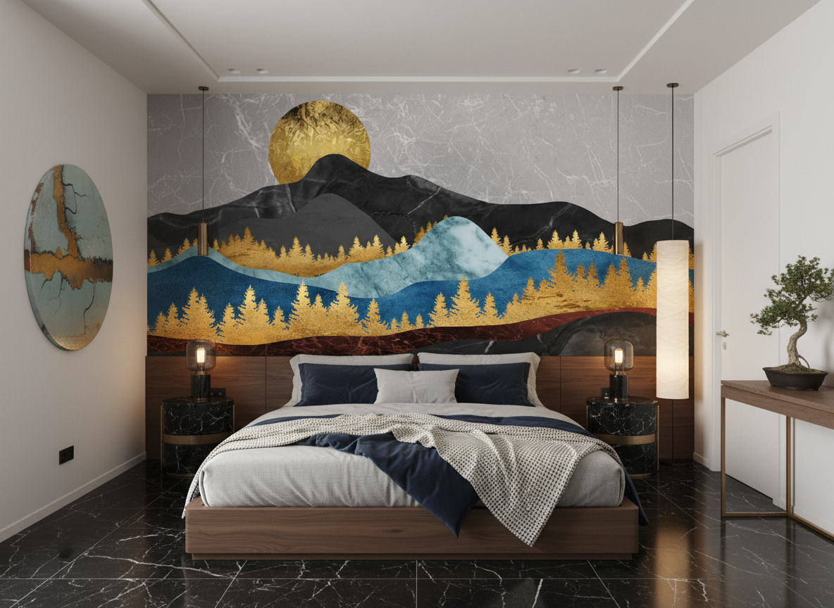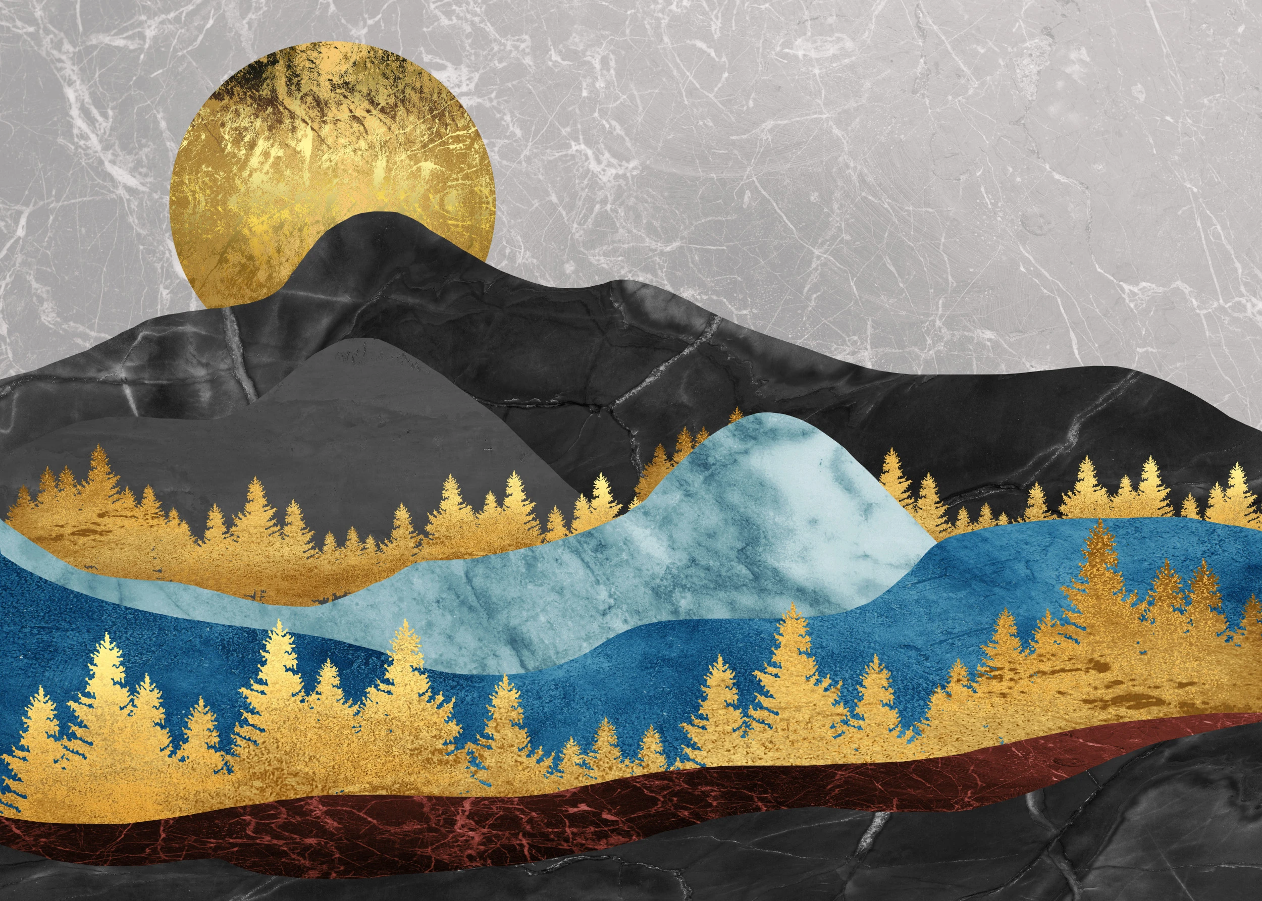 Ce papier peint paysage contemporain révèle une composition artistique d’exception, mêlant avec subtilité les techniques de l’aquarelle moderne et de la dorure précieuse. Au premier plan, une forêt de conifères dorés se déploie en silhouettes élégantes, créant une frise végétale d’une finesse remarquable. Les montagnes stratifiées se succèdent en vagues harmonieuses, alternant entre des tons de bleu profond, de gris anthracite et de rouge bordeaux, évoquant les strates géologiques d’un paysage millénaire. Un soleil doré nimbe la scène d’une aura chaleureuse, tandis qu’un effet de marbre veiné en arrière-plan apporte une texture sophistiquée à l’ensemble.