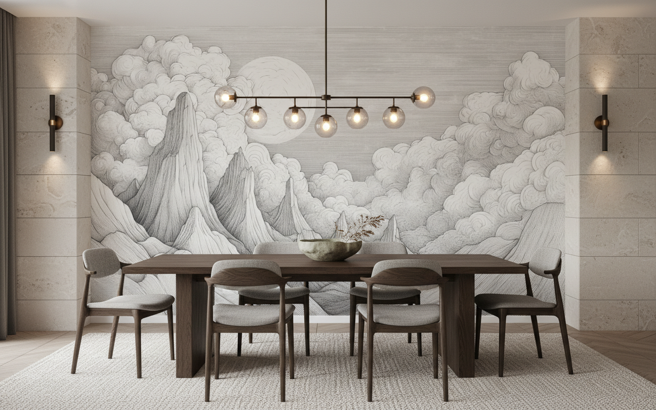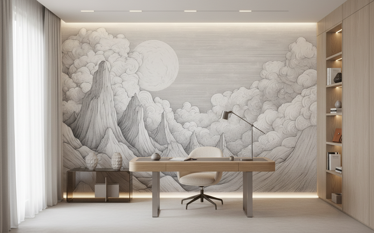 Idéal pour habiller un salon élégant, ce papier peint se marie harmonieusement avec des meubles en bois naturel, des textiles en lin écru et des accessoires en métal patiné. Dans une chambre parentale, il crée une ambiance apaisante propice au repos, particulièrement mis en valeur par un éclairage tamisé et des matières douces comme la laine ou le cachemire. Un bureau créatif trouve également dans ce décor une source d’inspiration constante, stimulant l’imagination et la réflexion.