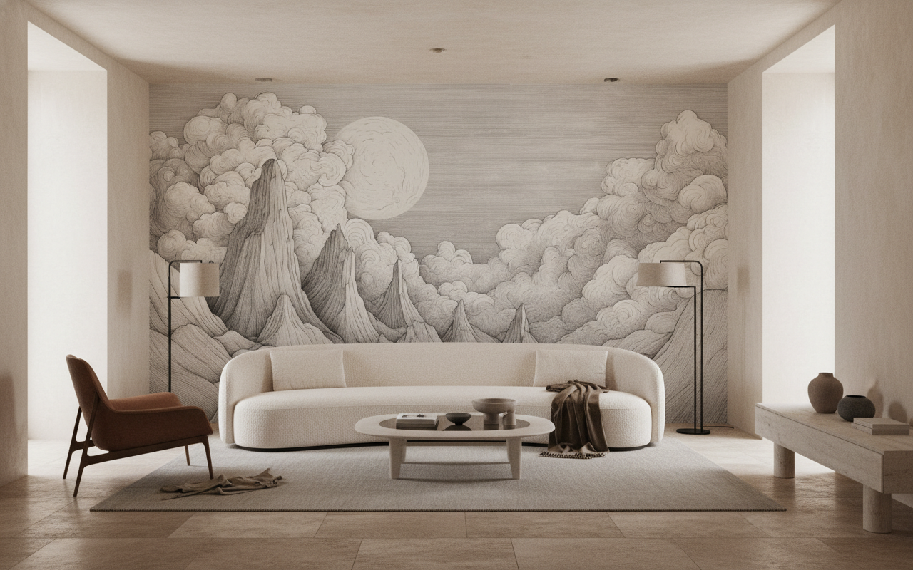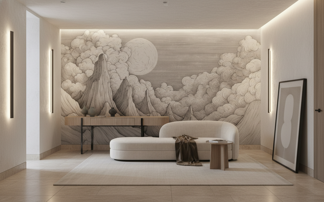 Pour sublimer cette fresque murale artistique, associez-la à des teintes poudrées – rose pâle, bleu grisé ou beige rosé – qui réchaufferont délicatement l’ensemble. Des plantes vertes aux feuillages graphiques apporteront une touche de vie contemporaine, créant un dialogue harmonieux entre nature stylisée et végétation réelle.