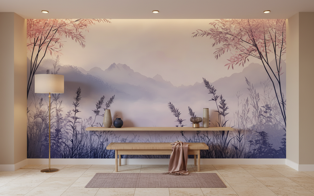 Ce papier peint paysage zen dévoile un panorama enchanteur aux tons pastel délicats, où se mêlent harmonieusement les nuances de rose poudré, les bleus lavande et les violets tendres. Au premier plan, une végétation luxuriante se dresse fièrement : hautes herbes ornementales, bambous graciles et feuillages exotiques se détachent en silhouettes graphiques contre ce décor onirique. Les montagnes embrumées s’étagent en plans successifs, créant une perspective aérienne qui évoque les plus belles estampes japonaises. Cette composition à l’aquarelle délicate capture l’essence même de la nature contemplative, où chaque brin d’herbe semble danser dans la brise du petit matin.
